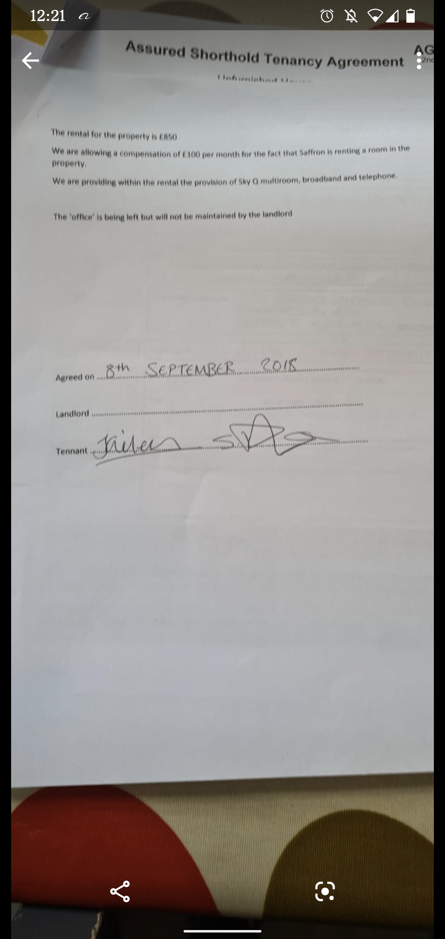 I notice the page from your tenancy agreement has not been signed by the landlord. Neither does it have a page number on it. (My tenancy agreement has every page numbered and both I and the LL have signed every page, as well as the signatory page at the end).