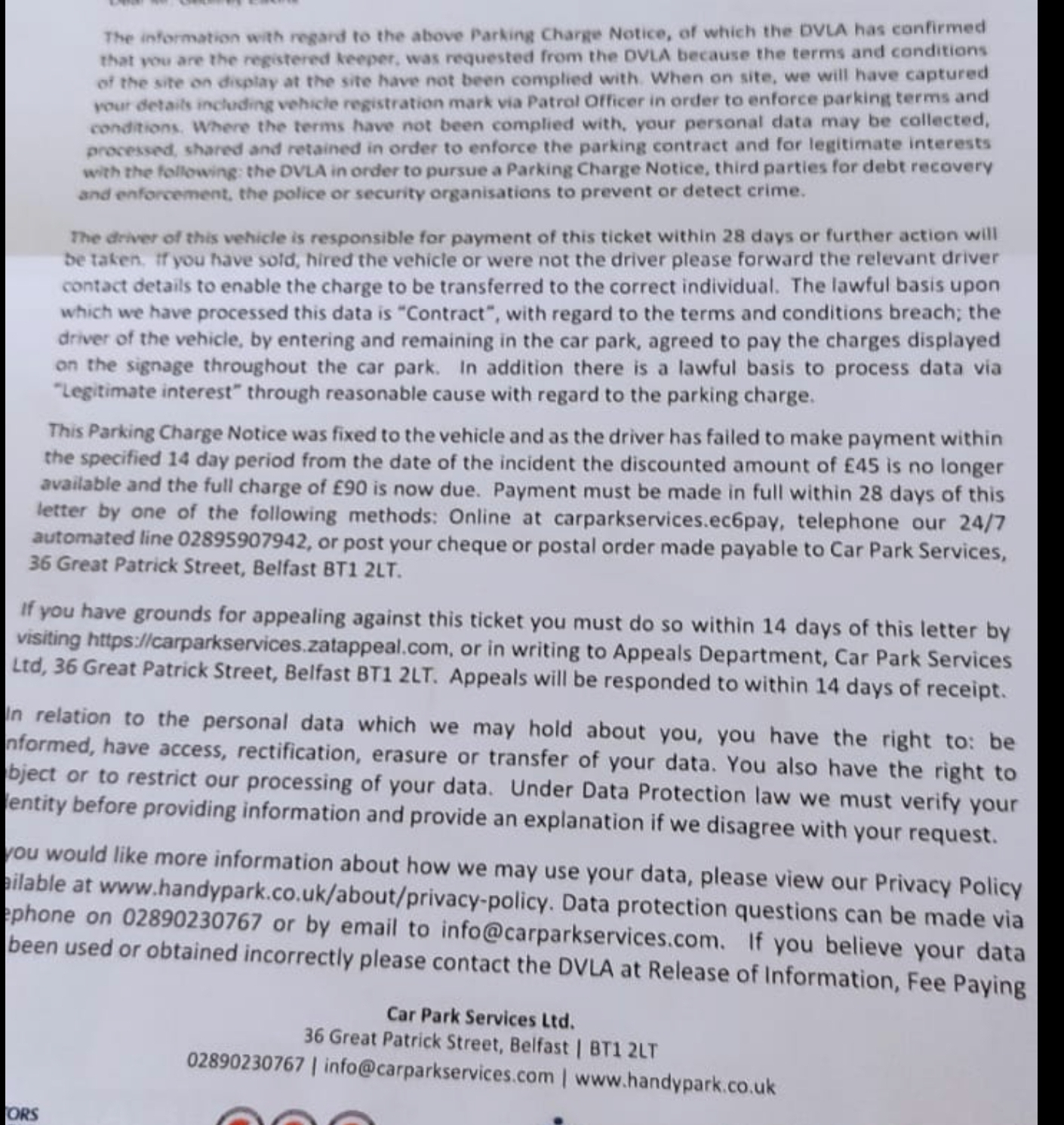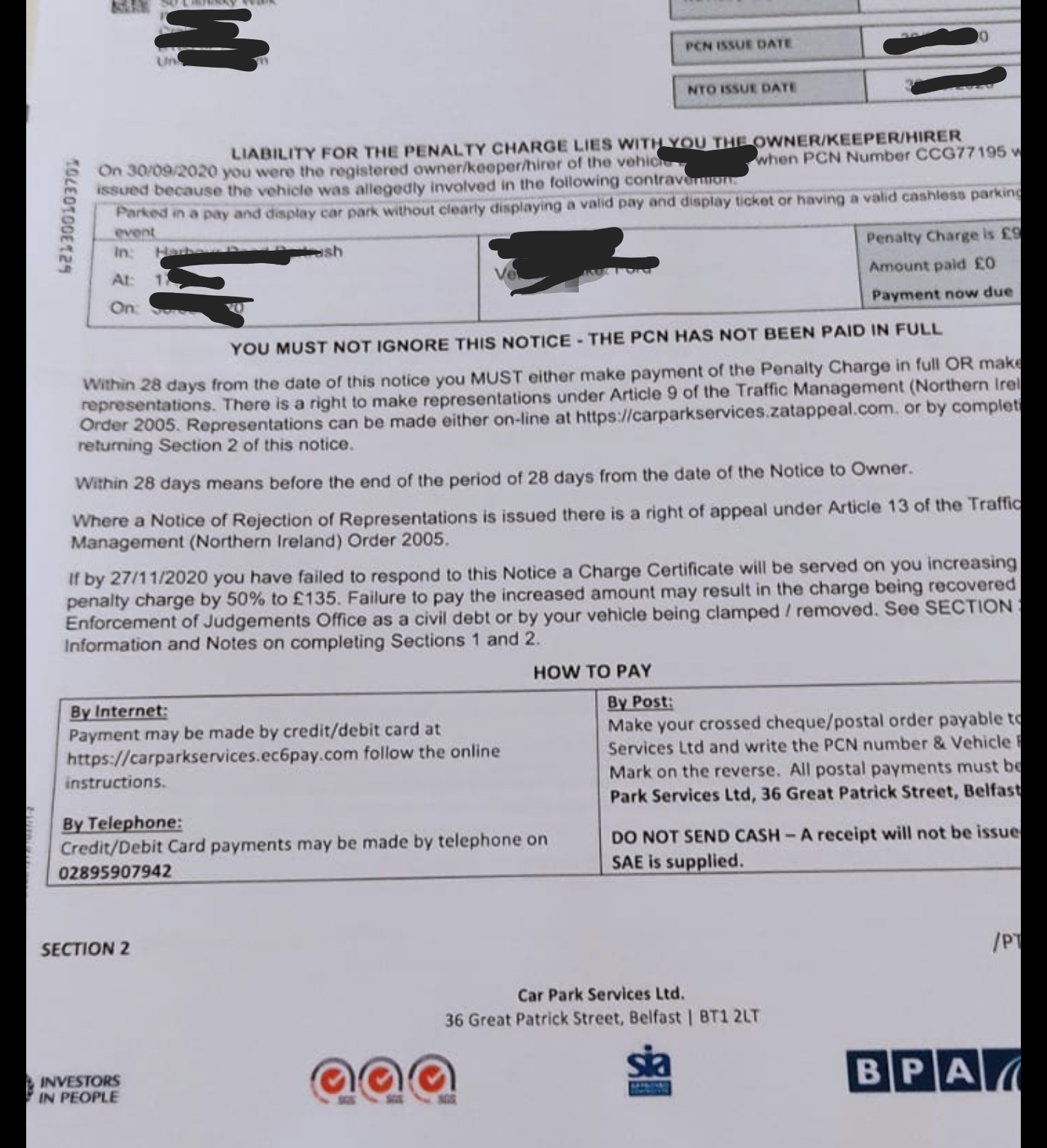 After this it's the cost, then how to pay either by internet or post. Payable to car park services, 36 Patrick Street Belfast