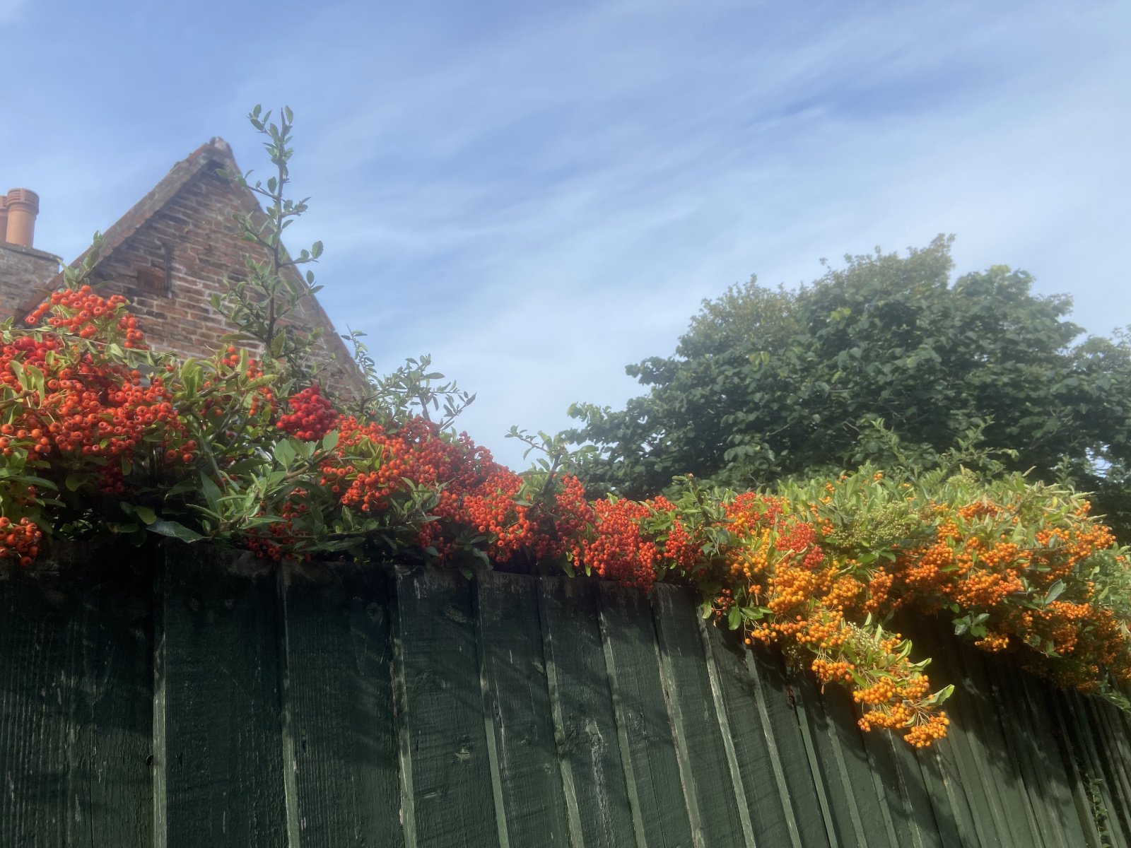 Did you get out brambling again PP? The brambleias were the only ones of any size I've seen round here. Yep the orange and red berries are pyracantha (pic taken a couple of days ago) and they did look good with the 2 colours together. Good for you holding out for the job you actually want, it's diminishes your soul going to work resentfullyNo I'd not though of taking the mystery plant home, it'd weigh a tonne and it's all interwiggled in the fence so too damaging to remove it. Sorry no I mean pinching things is wrong!