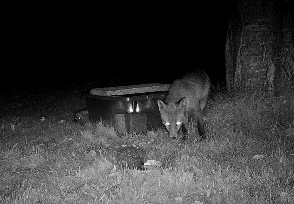 GB, we have spotted hedgehogs with white blotches on them too. They aren't the ones we've marked, because we use very small blobs of correction fluid.I've now resized the trail camera picture from Friday night, and it's loaded at last! It shows the fox arriving on the scene and two small hogs, one drinking and the other peeping around the corner of the feeding box. There's a half paving slab on top of the box to (hopefully!) prevent the fox from opening it or turning it over.Farway, you could try resizing.