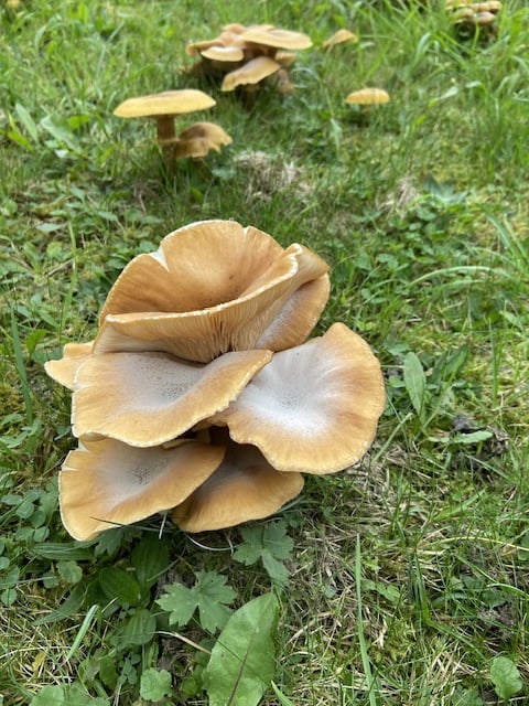 Leucopaxillus giganteus (Giant Funnel Cap): While the young specimens here aren't giant, this mushroom can start off with this shape and color. It would eventually develop into a very large, funnel-shaped cap.