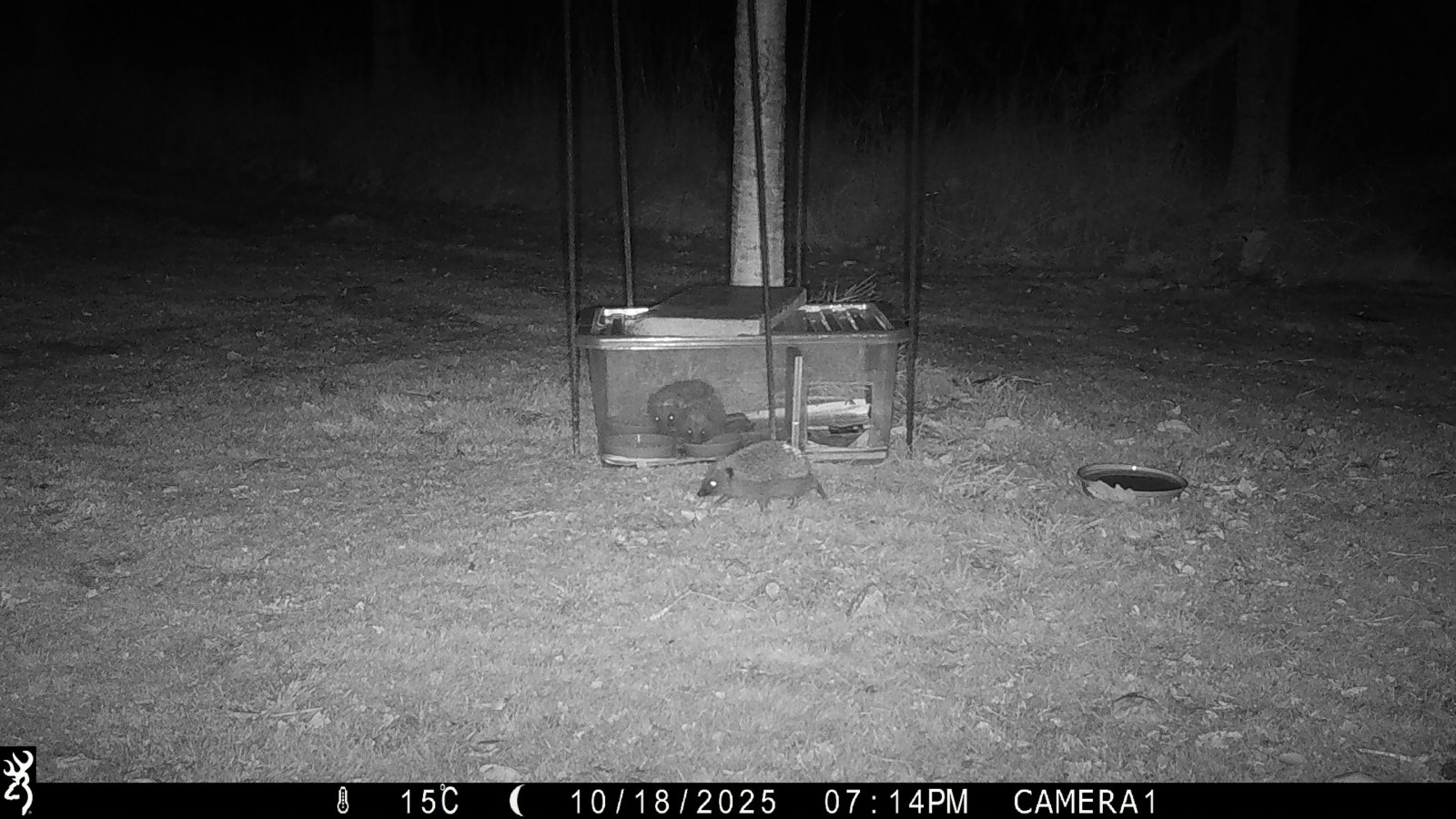 On the hedgehog front most of the food was cleared, so my prediction about mess wasn't the case, but somehow, one bowl had been neatly stacked on another!Here are 3 of the hogs in the early evening; 2 tucking-in, and one looks like it's making off, having had its meal.