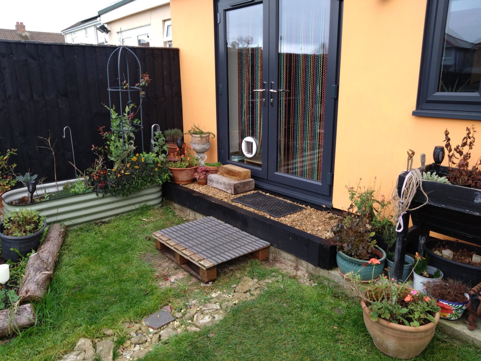 Thank you for the bird, he or she is gorgeous...They're wooden sleeper steps, painted black, it's Cuprinol Ducksback paint, ours is black to match the fences..Picture that will be taken down tomorrow ish. The second step will be where the pallet is