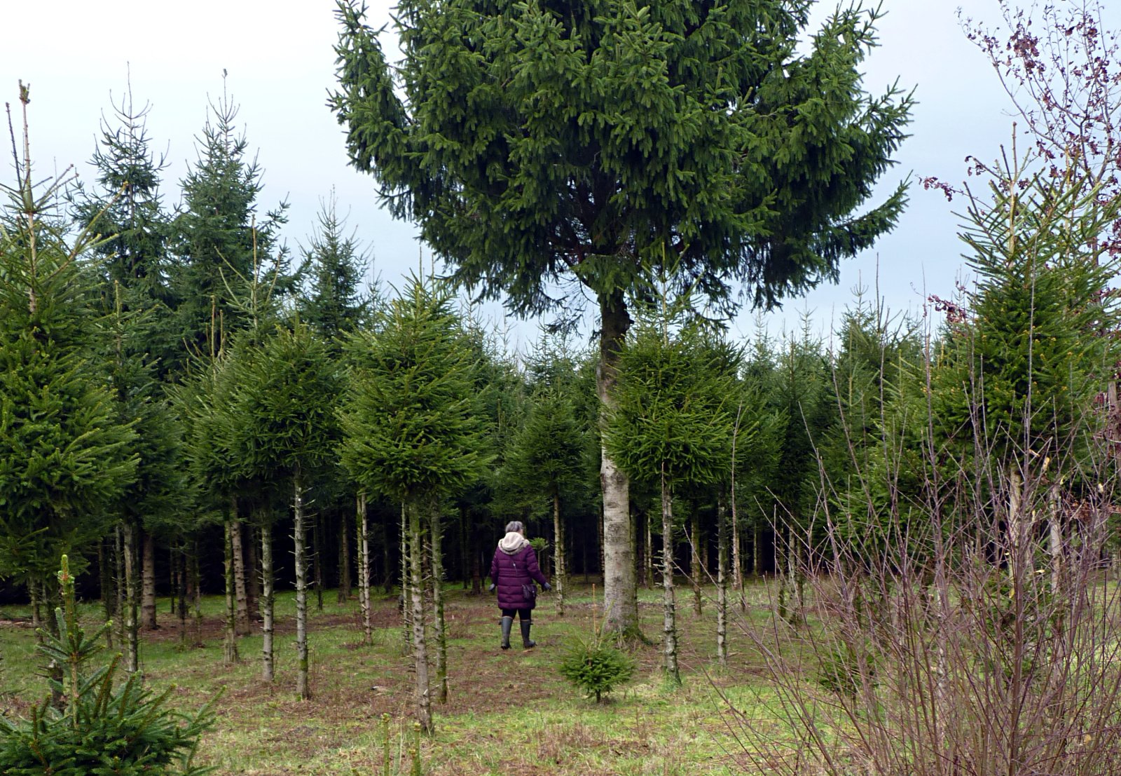 Yesterday it was reasonably fine outdoors when we searched for the perfect tree. We're still finding them at a place abut 8 miles away, where the plantation was neglected. Lower branches have been removed for access and re-planting, so the trees are on very long stems!