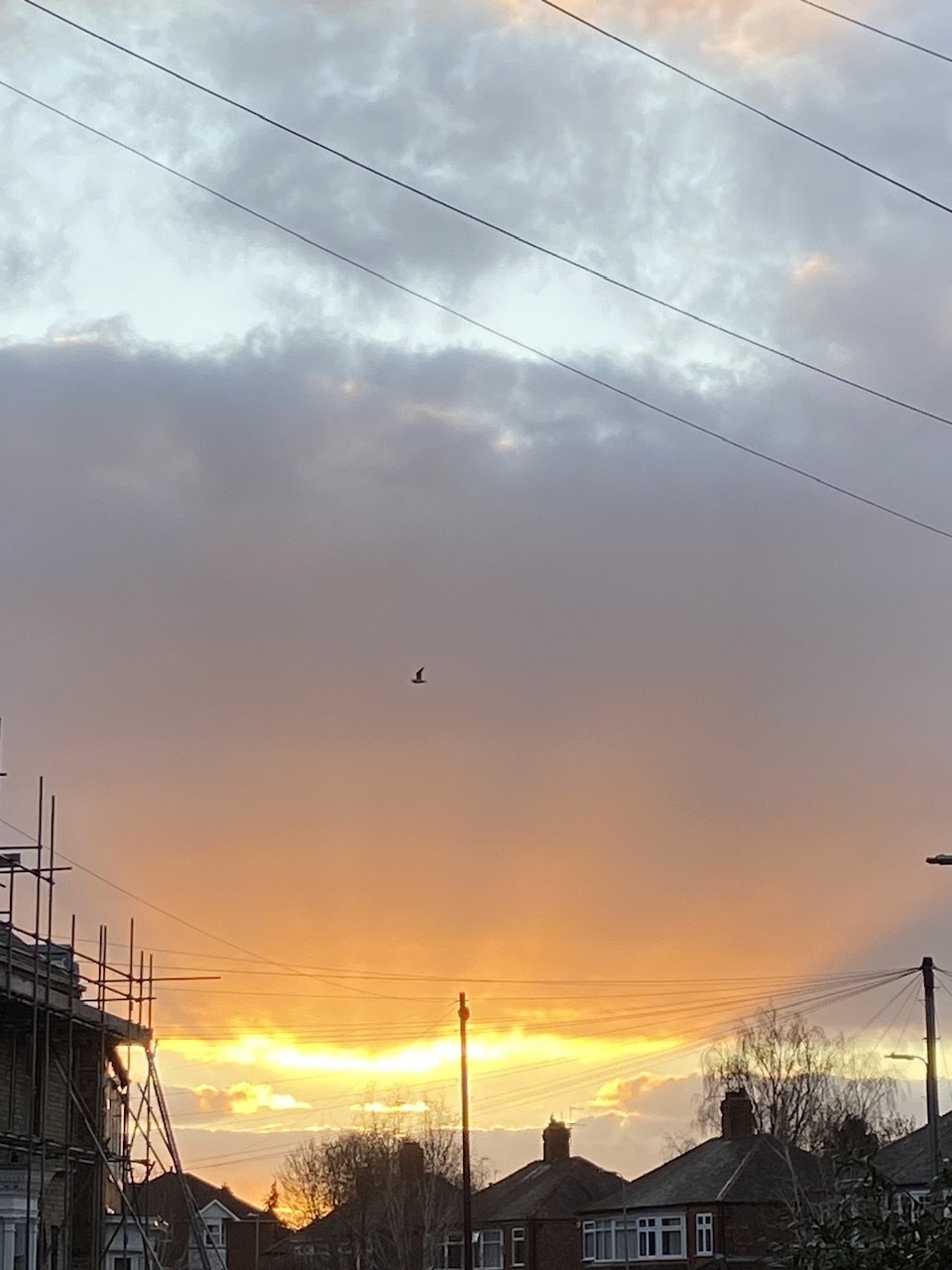 It was a half day at work and surprisingly the body count was 0, maimings 0, sarcastic remarks a coupla dozen. Win!Saw this on my way in. I think it’s a new sunrise, well I don’t think I’ve seen one like it before -