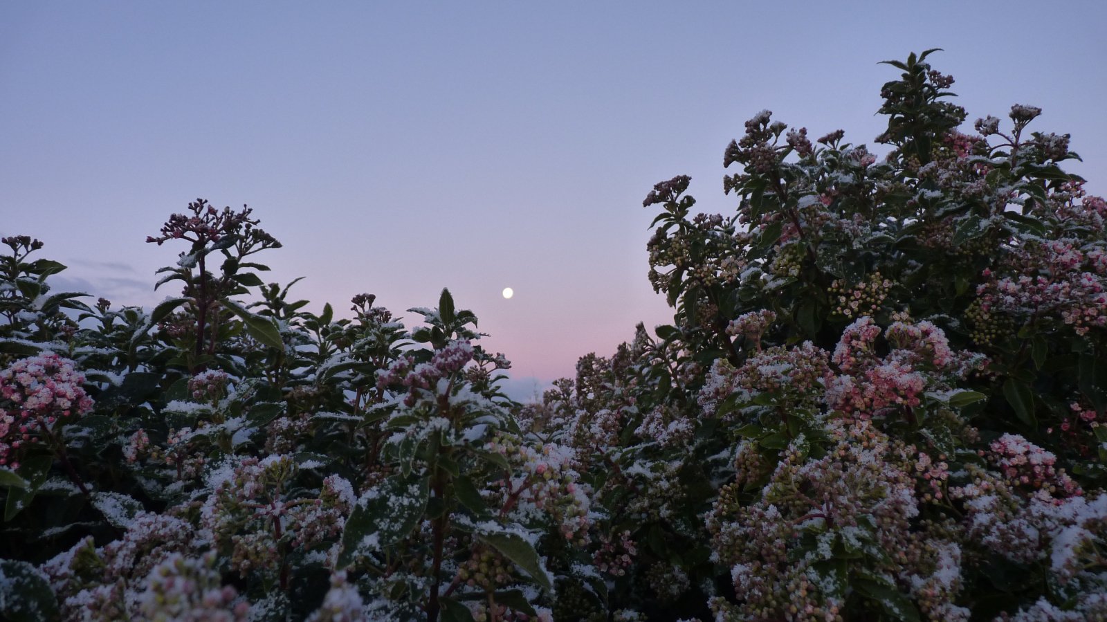 Today's photo is Viburnum tinus with a dusting of hail, and currently in full flower. OK, there might be a moon in there somewhere, too!