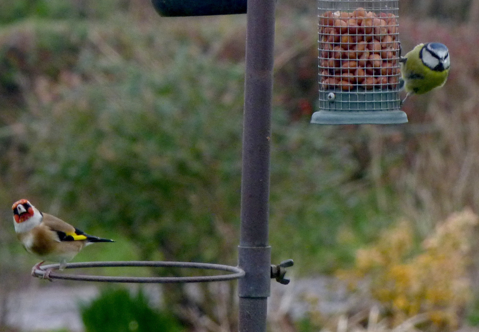 That's fairly boring, so here is a snap of two birds on the feeders yesterday, staring at me. One is a blue chest, but as you can see, it's really a yellow jersey.