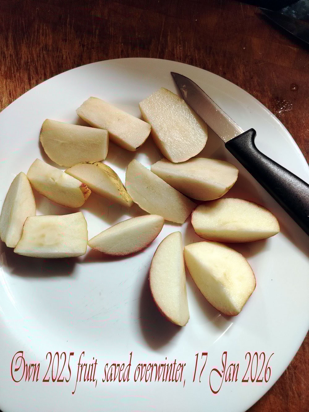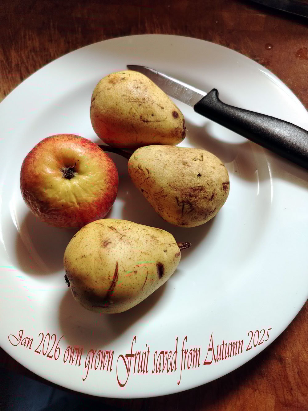 Here are the pics, look a bit manky but I never really stored them well, pears just in salad drawer & apples in a carrier bagThe pears went from green to yellow in fridge. Apple went from light blush to red / yellowThis year I'll store them properly, at least wrap in paper etc.Tasted fine though, and even better having last year's fruit still edible