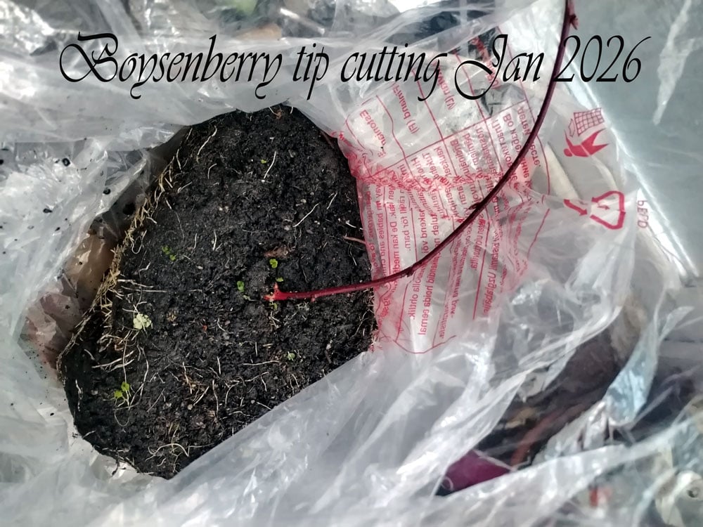 Farway that’s an impressive root system on that boysenberry, your dgd is lucky to have you passing plants on. I noticed my evergreen hydrangea cutting that I shoved in has taken, so I’ll offer that to someone in the family.