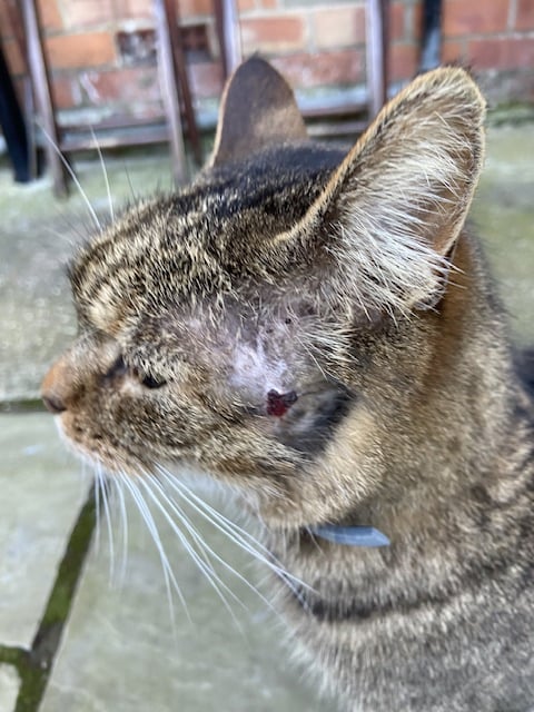 Speaking of cats - I took a photo at the weekend of the Holy Roamin' Terror. I hadn't seen him in a while, turns out Lovely Neighbour had been keeping him in cos he's damaged. Having cleared the place of all other cats, small dogs and errant children, he decided to take on a fox. Yep really. He either got half his face bitten or clawed off and his gums and teeth on one side are a mess. Poor s0d
