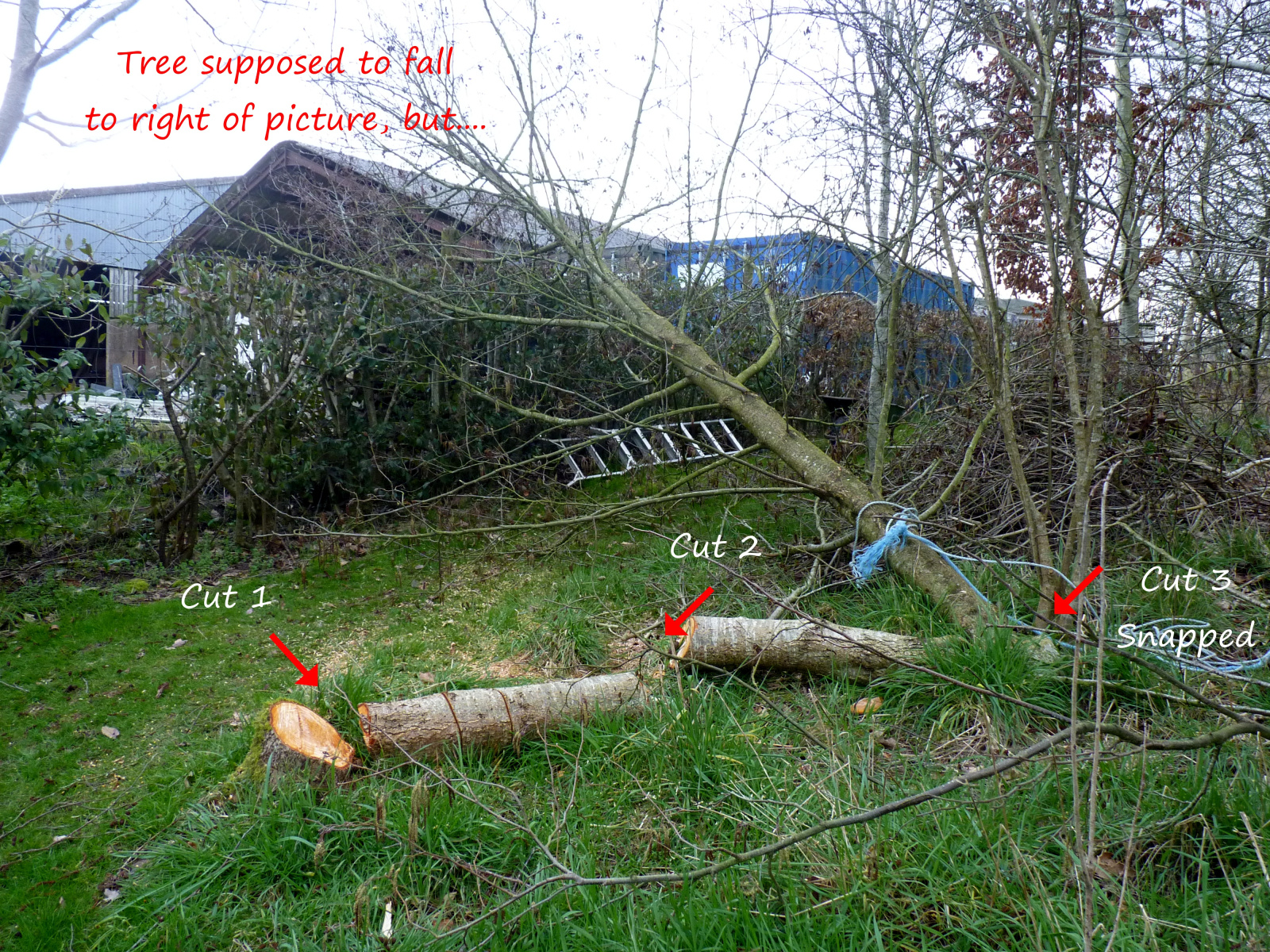 Back to the tree felling, which didn't need much sustained energy, other than climbing a ladder to secure ropes. I made a first cut at the base of the tree, a second a few feet up and then a third, but the latter two cuts didn't go right through. It's hard to explain, but often one can do this in calm weather with the tree in situ, then give a pull on a rope and the top bit falls where you want it. I went off to find Mrs Dusty, who was supposed to be rope pulling, but she'd gone to sleep.😖 So I returned, only to find the tree had come down! The top part had twisted and fallen in the wrong direction. Well, at least it didn't hit the caravan. 😇
