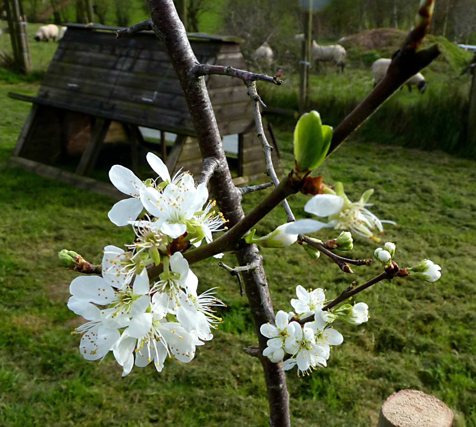 people vote the wrong way herewe're in the 'wrong' postcode. If April's cold we'll get more logs. Again, they'll not be wasted.😇Lovely, blossoms Bluey, but cat wee tree is in May. Here are the few flowers on our newly-planted damson (with a few naughty sheep trashing my bonfire in the background!) Can't light it anyway, because of the hogs.