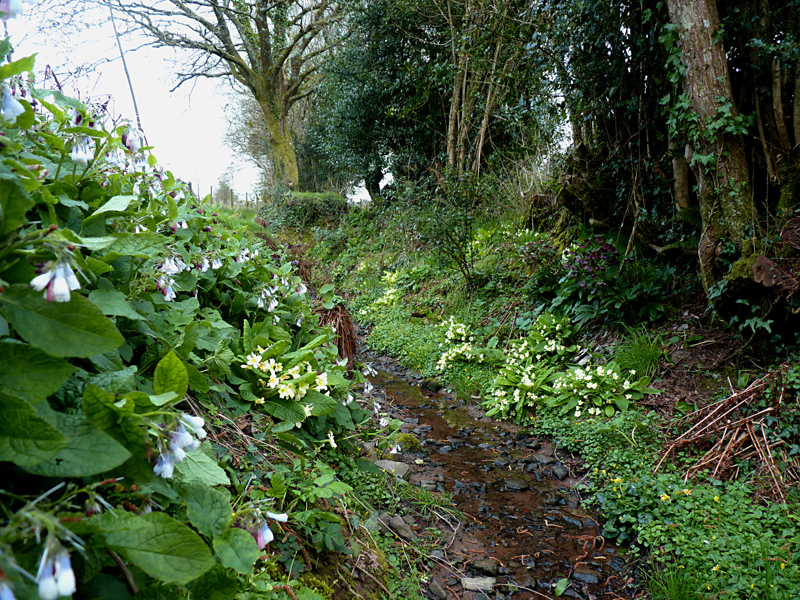 BoysenberriesJostaberries. We had a huge thicket of what I suspect was them when we moved here. It was a great wildlife retreat, with the bushes so tight no human could get in. I'm afraid we instructed the digger guy to pull them out, and they went on 'the heap.' 😩 To be fair, the garden was untamed jungle everywhere you looked. We just wanted it cleared. 😥I keep forgetting to post a picture of the stream area, so here it is. The stream is just a trickle now. I'm sure there are fewer primroses this year, but the Iberian comfrey and geraniums are doing OK.
