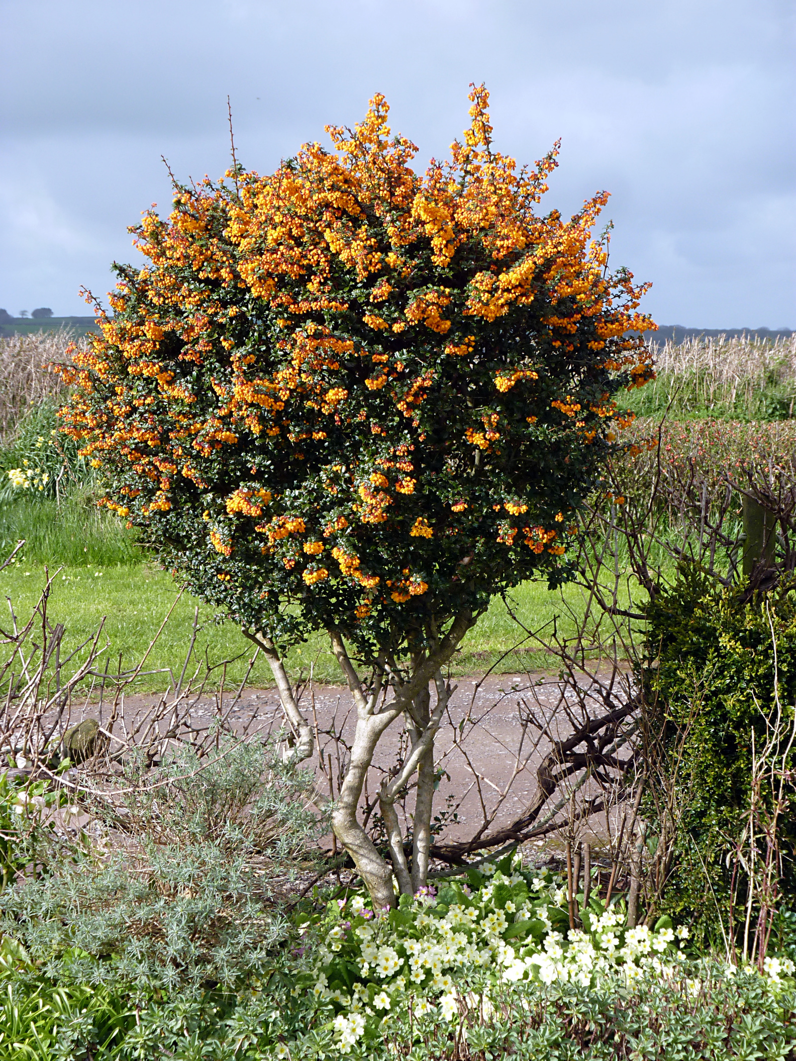 We do have this Berberis darwinii, which the bees adore. Mrs Dusty has raised the crown on it. The next step is to place some more interesting plants under and around it. That border hasn't been touched in ten years!