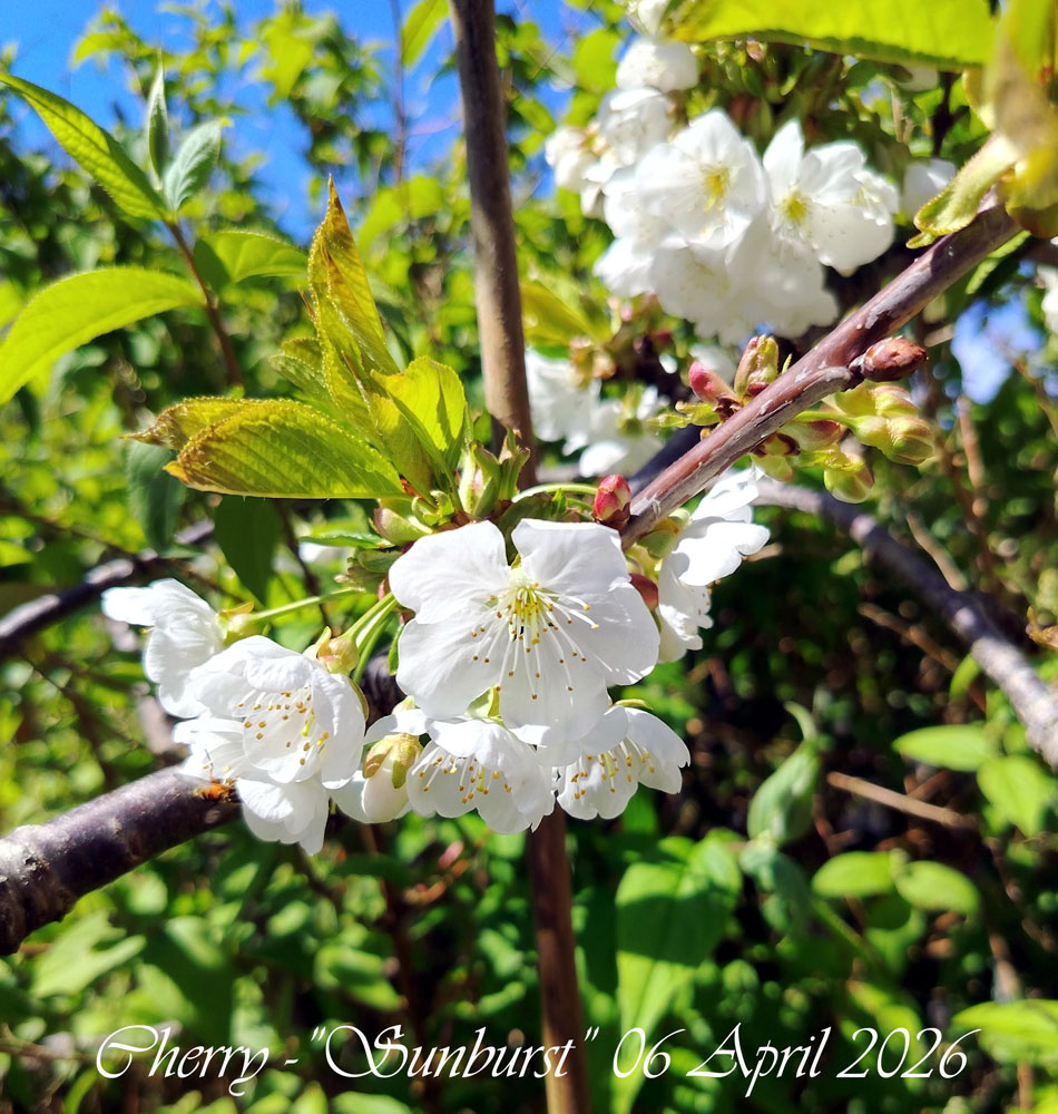 The sun is bringing all the blossom on now, apples are pink buds and just waiting to go, the other pears have opened, get pollinating you bees, and last, good old Sunburst is out.
