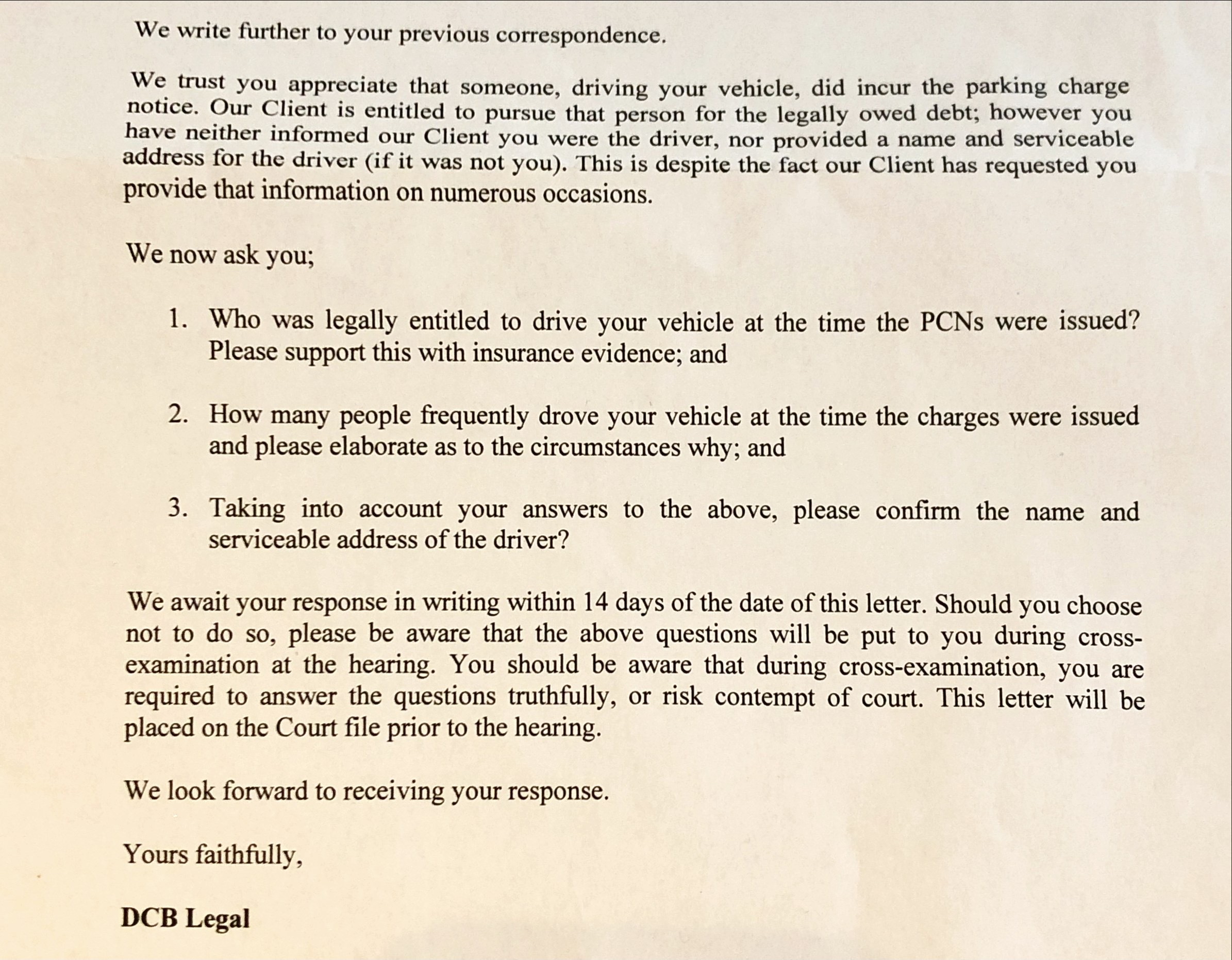 So why do you think they are asking these questions? Is it because they know their client did not comply with the requirements of PoFA and unless they know who the driver was, their case is pretty well shot? Ignore the letter, or reply telling them to ask their client as they seem to think they have a case against the driver, it is for them to prove who the driver was, not for you as the registered keeper of the vehicle.Please note, we are not a legal advice forum. I personally don't get involved in critiquing court case Defences/Witness Statements, so unable to help on that front. Please don't ask. .