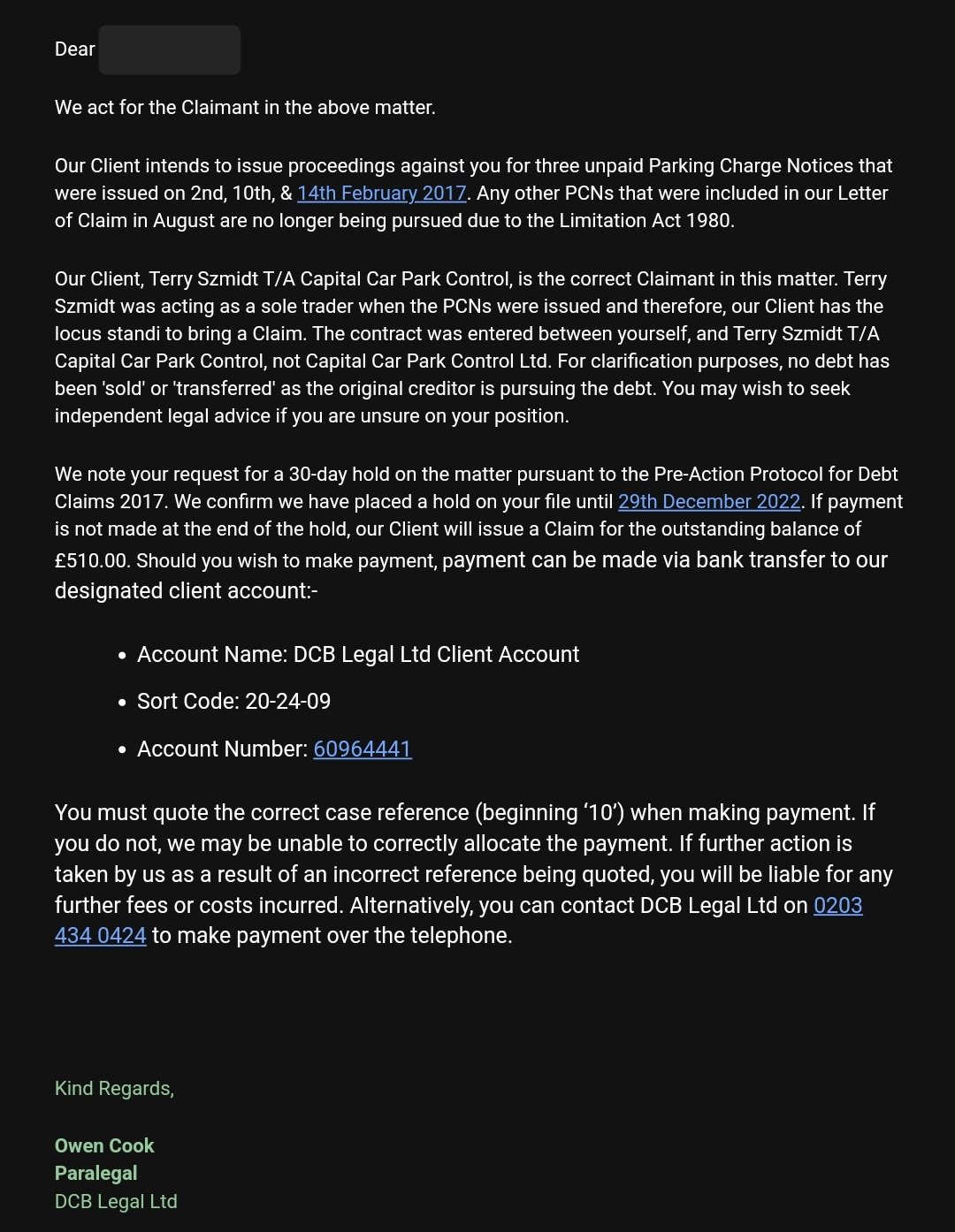 "Dear me,We act for the Claimant in the above matter.Our position regarding the Claimant was outlined on 28th November 2022. Our position will not be re-addressed.In line with our email dated 28th November 2022, if payment of £510.00 is not paid by close of business today, a Claim will be issued. Payment can be made via bank transfer to our designated client account:-Account Name: DCB Legal Ltd Client Account Sort Code: 20-24-09 Account Number: 60964441You must quote the correct case reference (beginning ‘10’) when making payment. If you do not, we may be unable to correctly allocate the payment. If further action is taken by us as a result of an incorrect reference being quoted, you will be liable for any further fees or costs incurred. Alternatively, you can contact DCB Legal Ltd on 0203 434 0424 to make payment over the telephone.Kind Regards,Owen CookParalegalDCB Legal LtdTel: 0203 434 0433 | DX 23457 Runcorn"