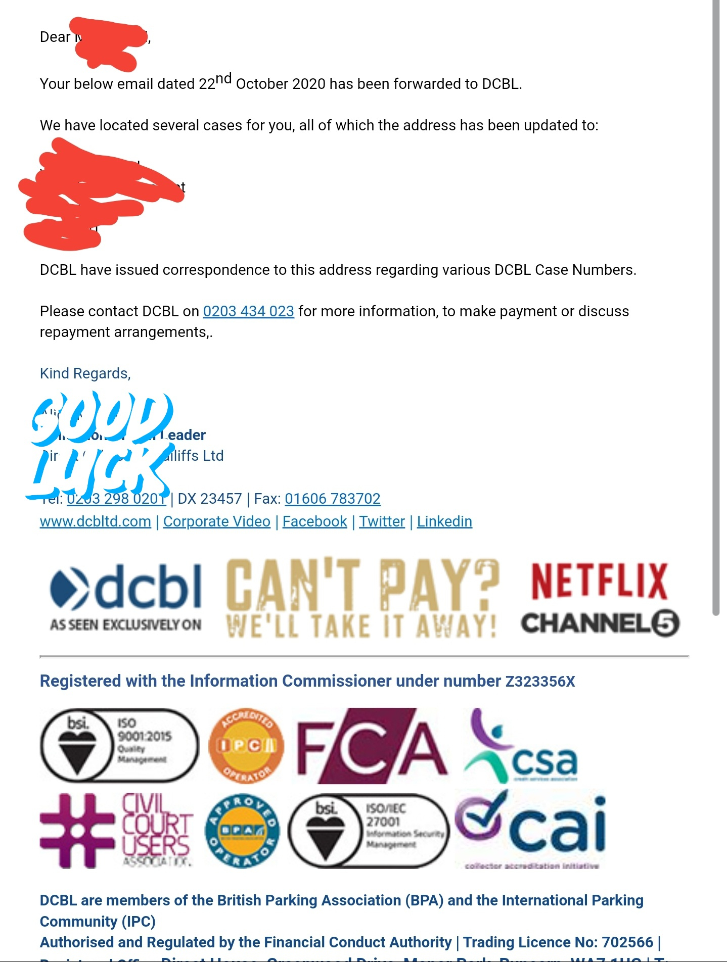 Plus as Johnnersh said and I intimated , keeping hold of any data and tracking of the source of that data as a data controller could be a dpa breach regarding the old address and the various PCN,s that are being chased , meaning it's worth a counter claim punt to go in with the defence if a court claim was issued