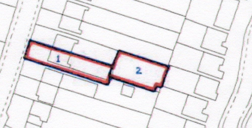 The area marked '1' has the house and a patio/garden directly behind it. Area '2' is offset, and contains garage, hardstanding for 3 cars and another garden. I can post an aerial too if that helps?