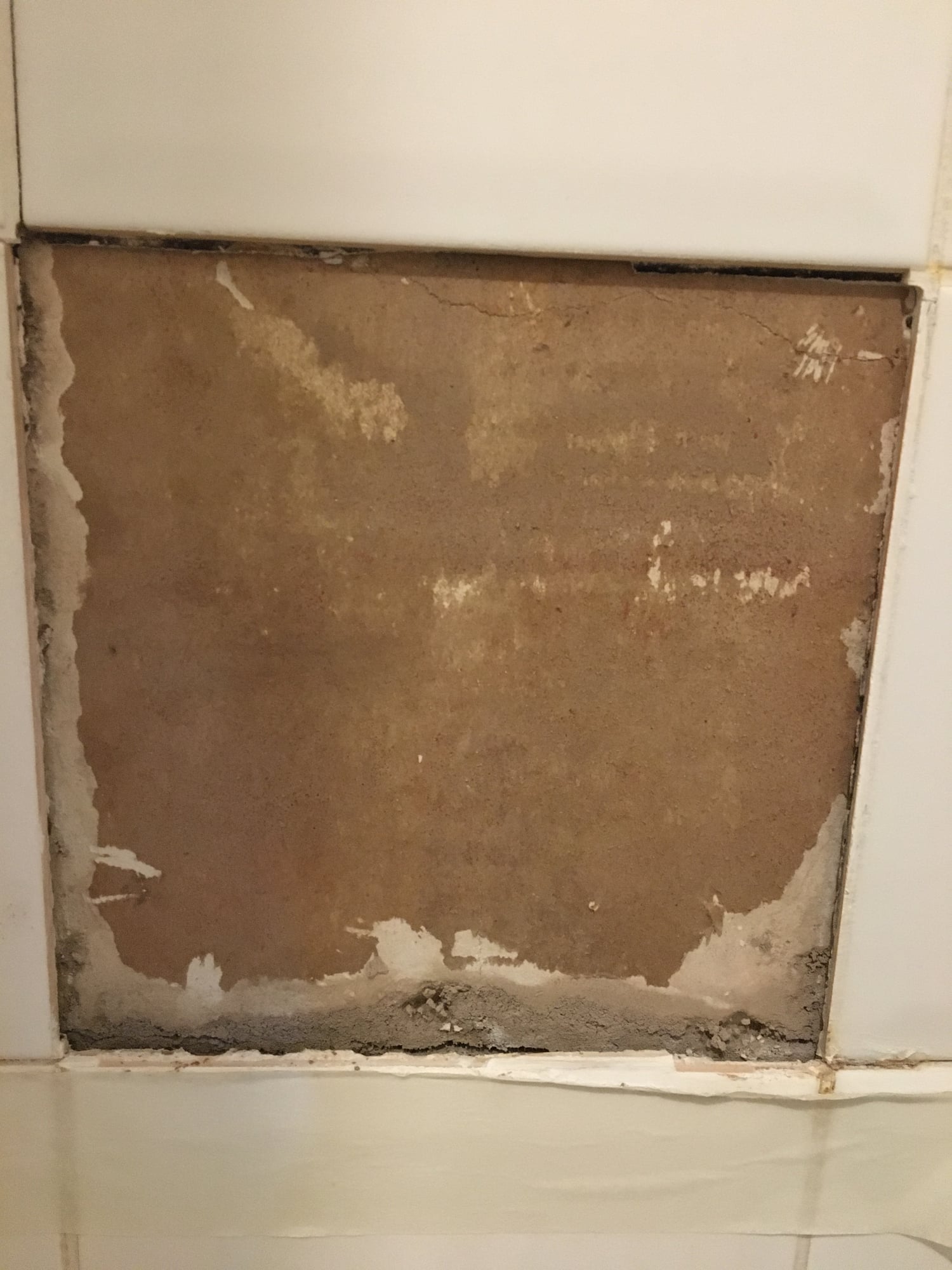 Hii have a few loose shower tiles due to settlement grout cracks I believe. I’ve used a grout rake to get one out and got some adhesive and new grout to stick it back. The surface behind though is a bit weird - i thought it was damp but left it for a week and ran a hairdryer on it but it didn’t change. Then I realised the darker brown bit I thought was damp flaked away if you prodded it. Behind that it appears dry. Any idea what this layer could be? Seems slightly damp to the touch and is the same on the back of the tile. Could it be primer? Not sure what type of board it is behind.