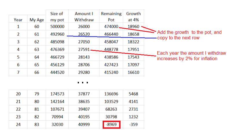 Secret2ndAccount said:I reckon this is as easy as I can make it. Mythical portfolio 1/2 million, withdrawing 26k per year, growing 2% per year with inflation. Pot growing at 4%.This would be a pretty bad plan as it runs out of money at age 83, but it should illustrate how simply we can calculate what actually might happen