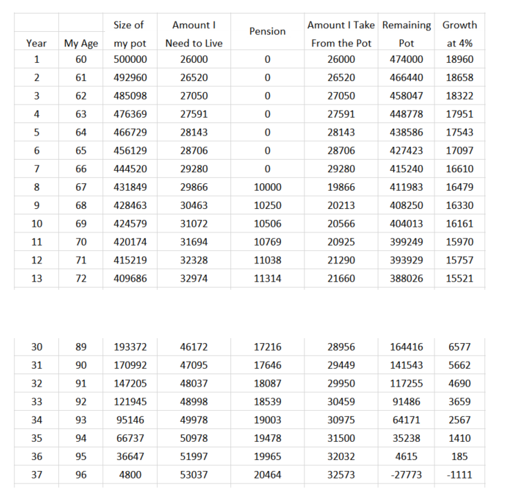 GSP said:Does that include the State Pension? If not, the inclusion of that would get me over the line.Then you're good to go. If you've got half a mil you can retire at 60.If you have a spreasheet like the ones here you can play what-if? until your fingers are sore. You can take a bit more, and see how much sooner the pot runs out. You can start by taking a bit less, and grow the withrawal just a little (even 1%) per year, and see the picture. You might find you don't give up very much now in order to have a bit more comfort in your late 70's. There's no right answer - it's each to their own - but this is an easy way to look at a dozen (or a 1000) scenarios.