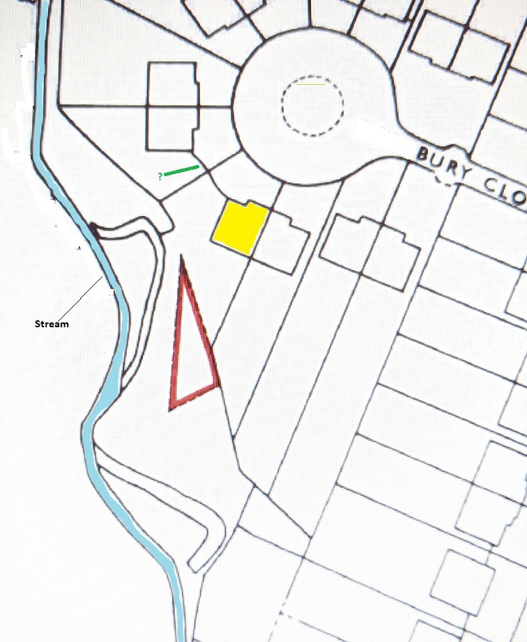 I viewed the house today and it is a fairly standard semi-detached house in a close and the rear garden goes all the way to the stream. The triangular shaded area as far as I could see was part of the garden and nothing special with no structure or anything over it. It was just overgrown with weeds as was the rest of the garden.