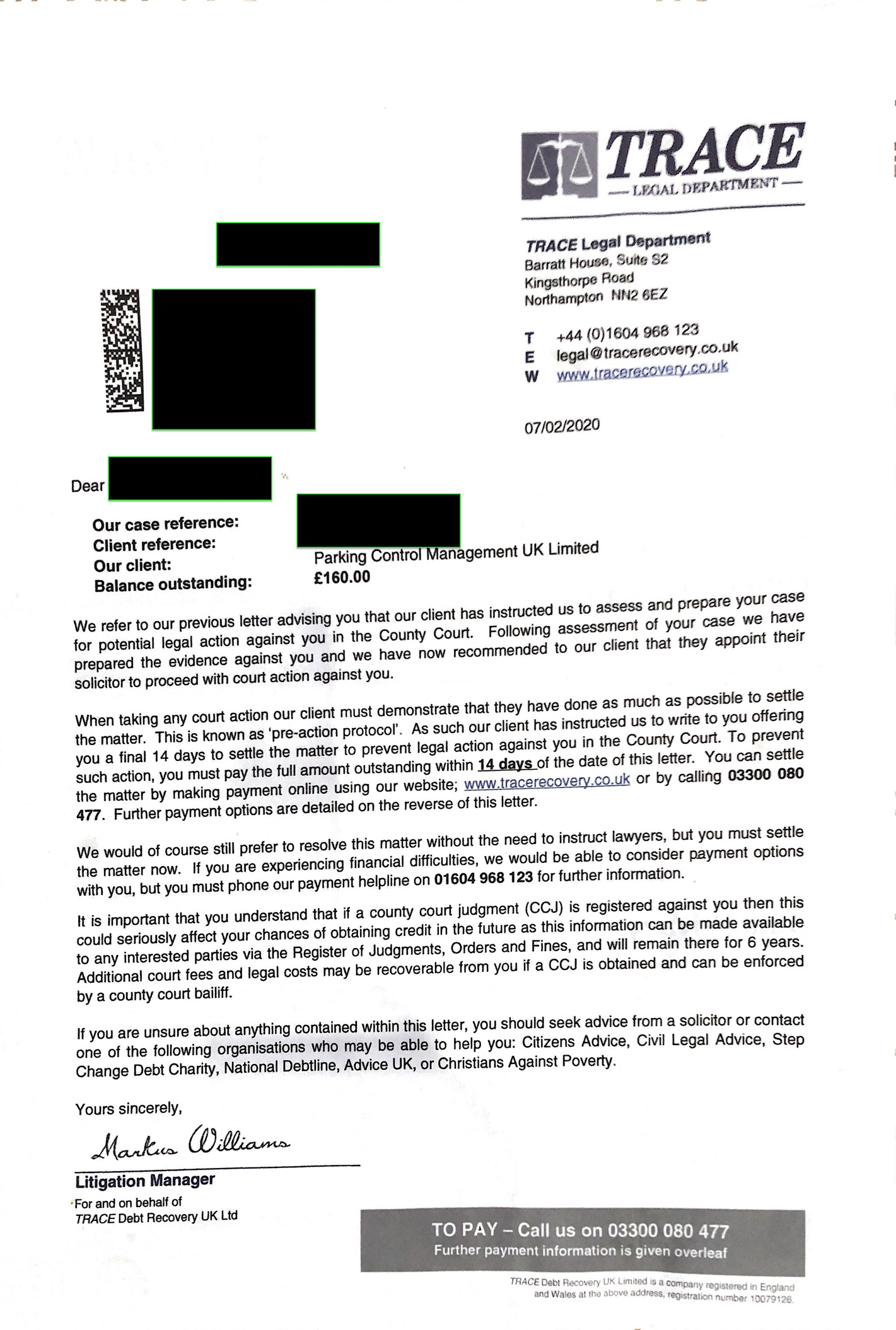 Redx said:The TRACE letter is about an earlier PCN from PCM UK LTD , nothing to do with your Parking Eye court case3