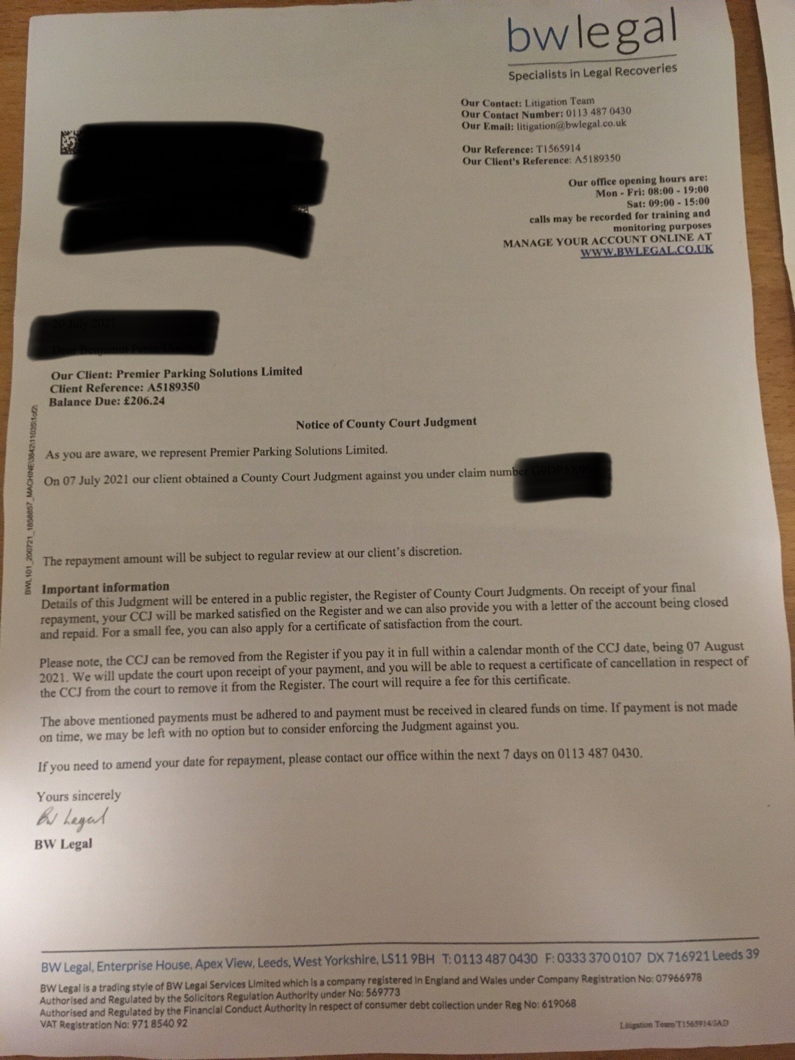 It is possible the Order is wrong - and if so it can be amended under the 'slip rule' if push comes to shove - so go by what the solicitor's agent told BW Legal from his/her notes of the hearing. But don't talk about that, just ring up, refer to their letter dated xx/7/21 and tell them you want to pay by debit card and get email confirmation immediately. If they say it's £206.24 and confirm full settlement by email, then that's it.PRIVATE 'PCN'? DON'T PAY BUT DON'T IGNORE IT (except N.Ireland).