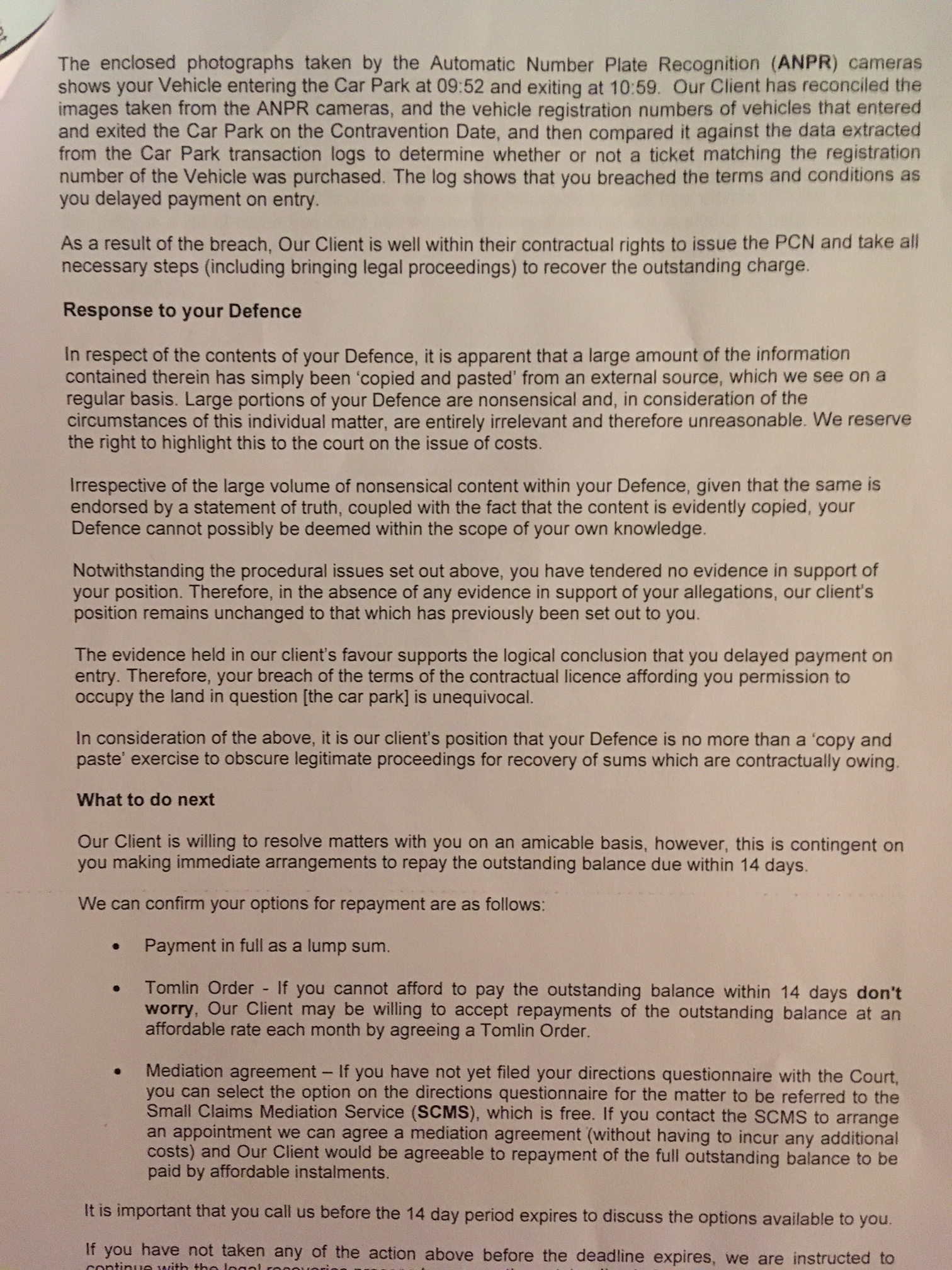 Since my last message, I have received a response to my defence and they are still going ahead with the claim.