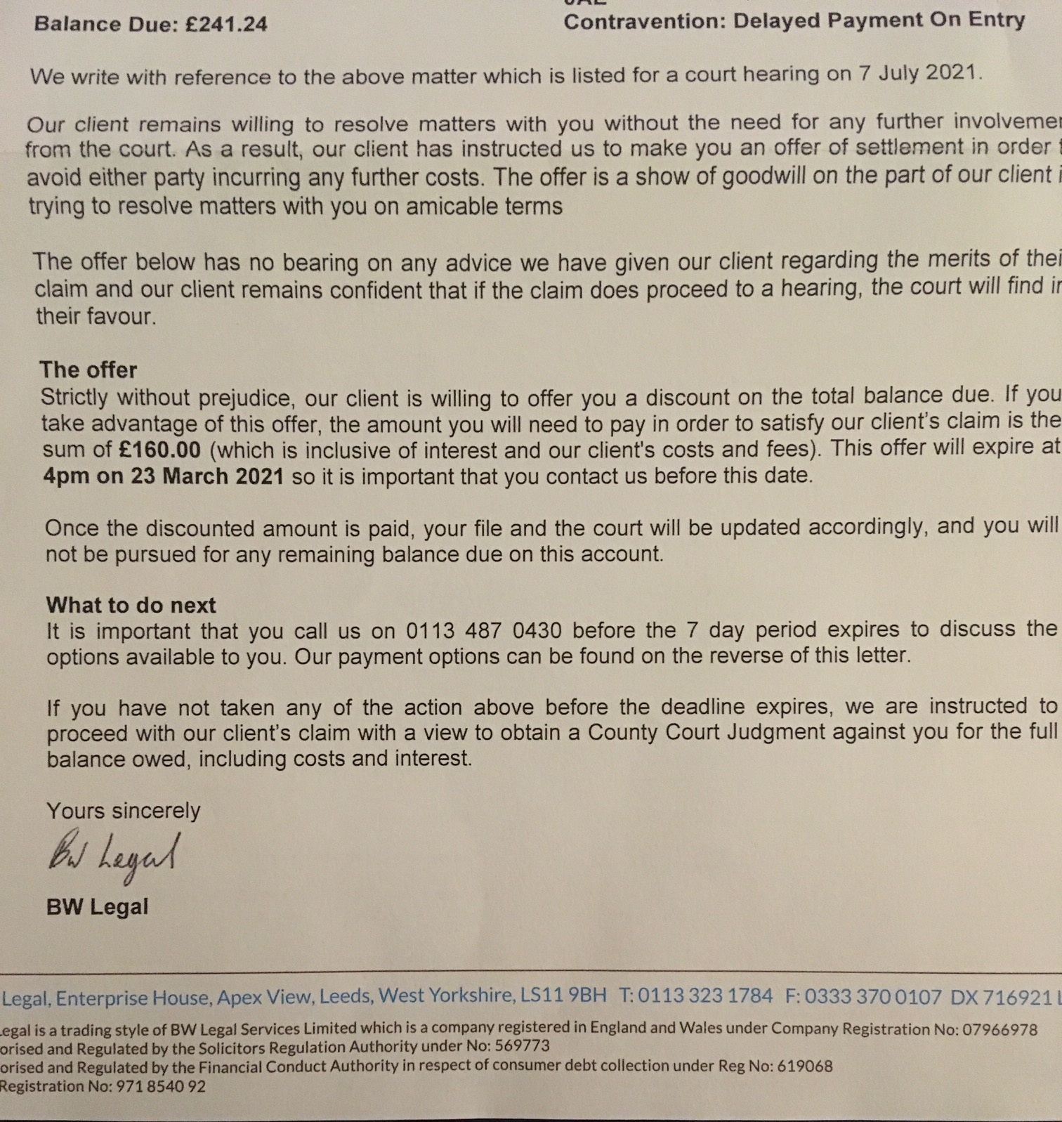 This was shortly followed by a 'discount offer' from BW legal which I thought was odd. I guess they know they're probably not going to win.