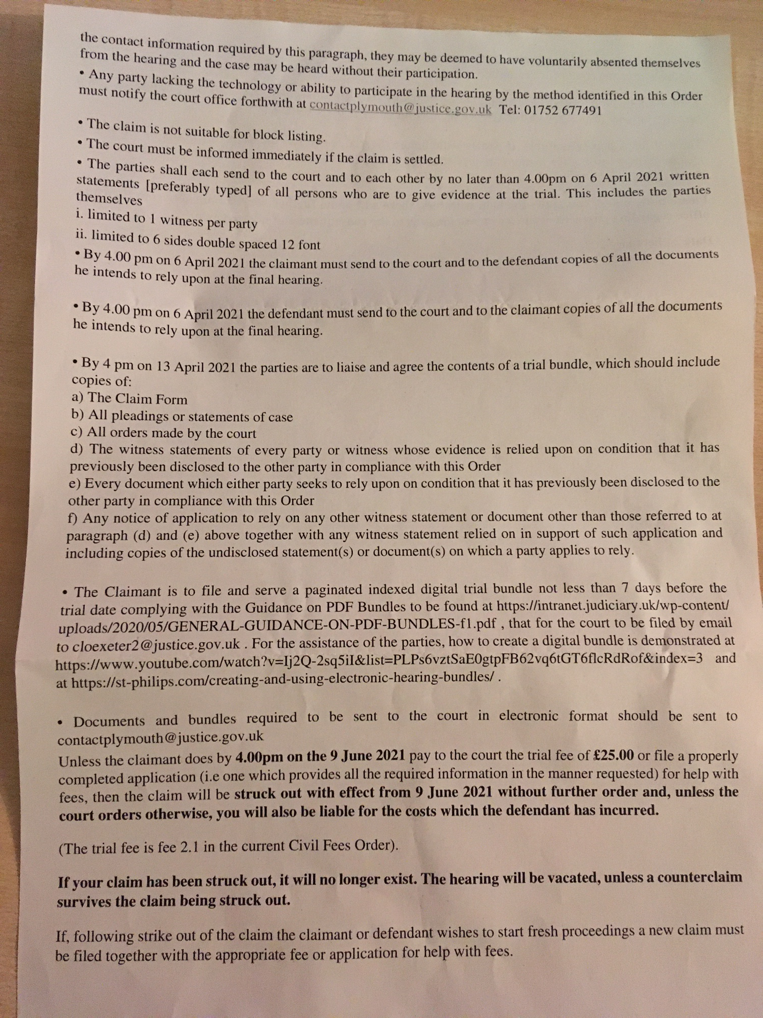 I've recently received my notice of allocation so I'm on to the witness statement stage. The hearing date is set for the 7th of July. I'm a bit confused about the deadline dates for my WS and supporting documents. On the newbie's thread, it mentions this stage should be completed no later than 14 days before the hearing. On my notice of allocation, it states that I need to send all evidence I wish to rely on to the court and claimant before the 6th of April, then agree on a Trail bundle by the 13th (including WS).
