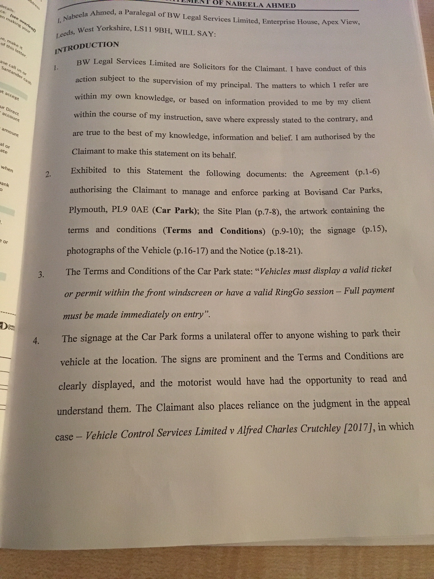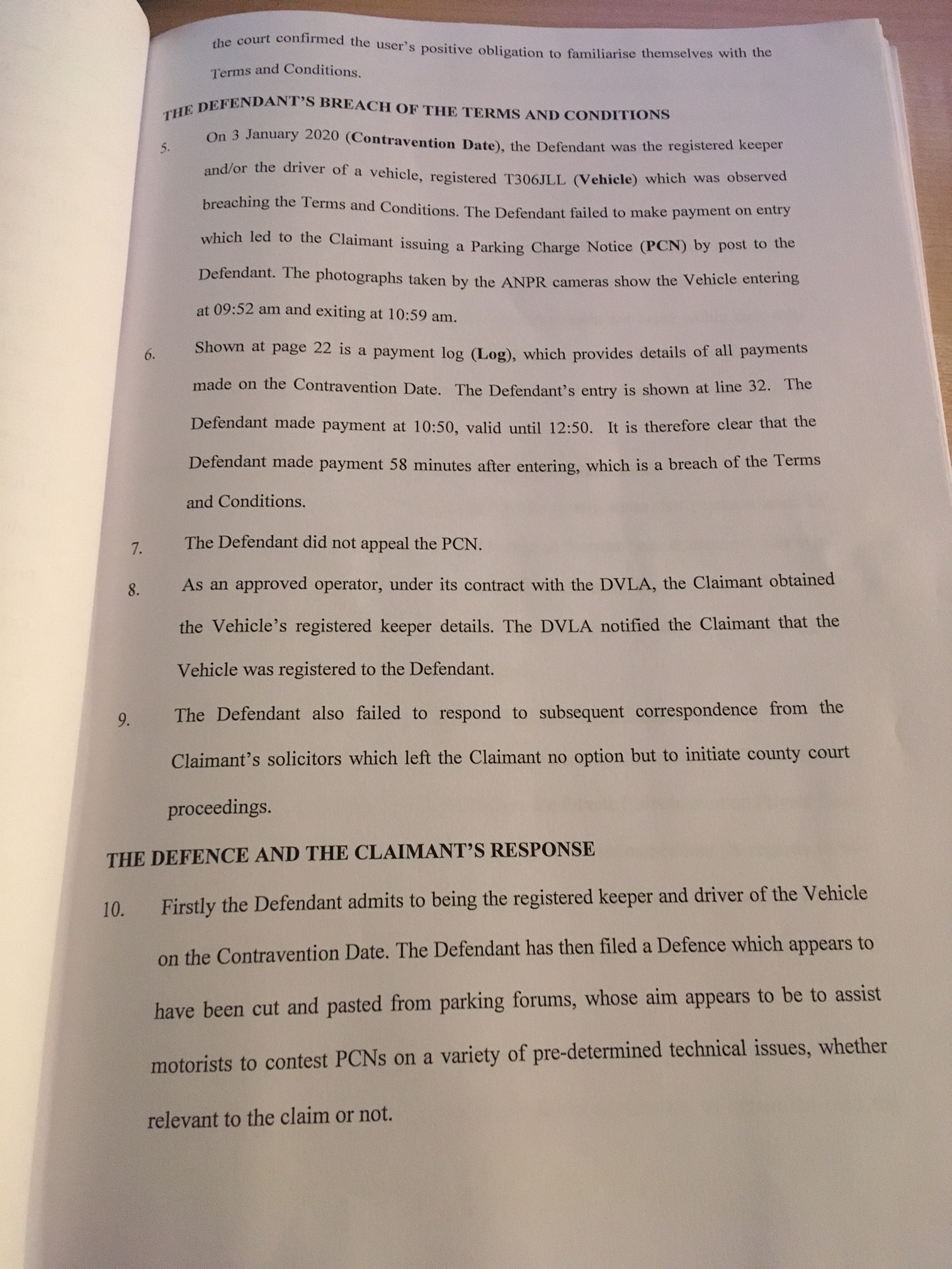 3. The Claimant’s case has been based on a supposed delayed payment on entry recorded on the 03/01/2020 at Bovisand car parks. The Defendant paid in full for the time spent at the car park and was shocked to hear that this event was even a case to be considered. The Claimant had not stated a set time that the payment needs to be made, therefore making the basis of their case invalid. It is also not listed in the contractual terms that the Defendant can be punished for 'paying late’ and even if it was a listed term, the Supreme Court case of ParkingEye v Beavis confirmed that the purpose of a parking charge must never be to merely punish a driver.