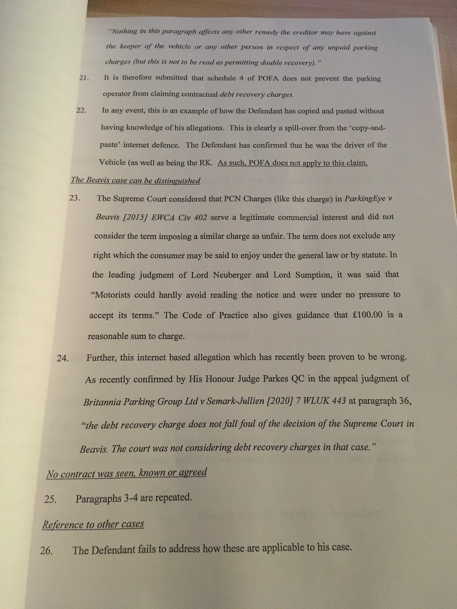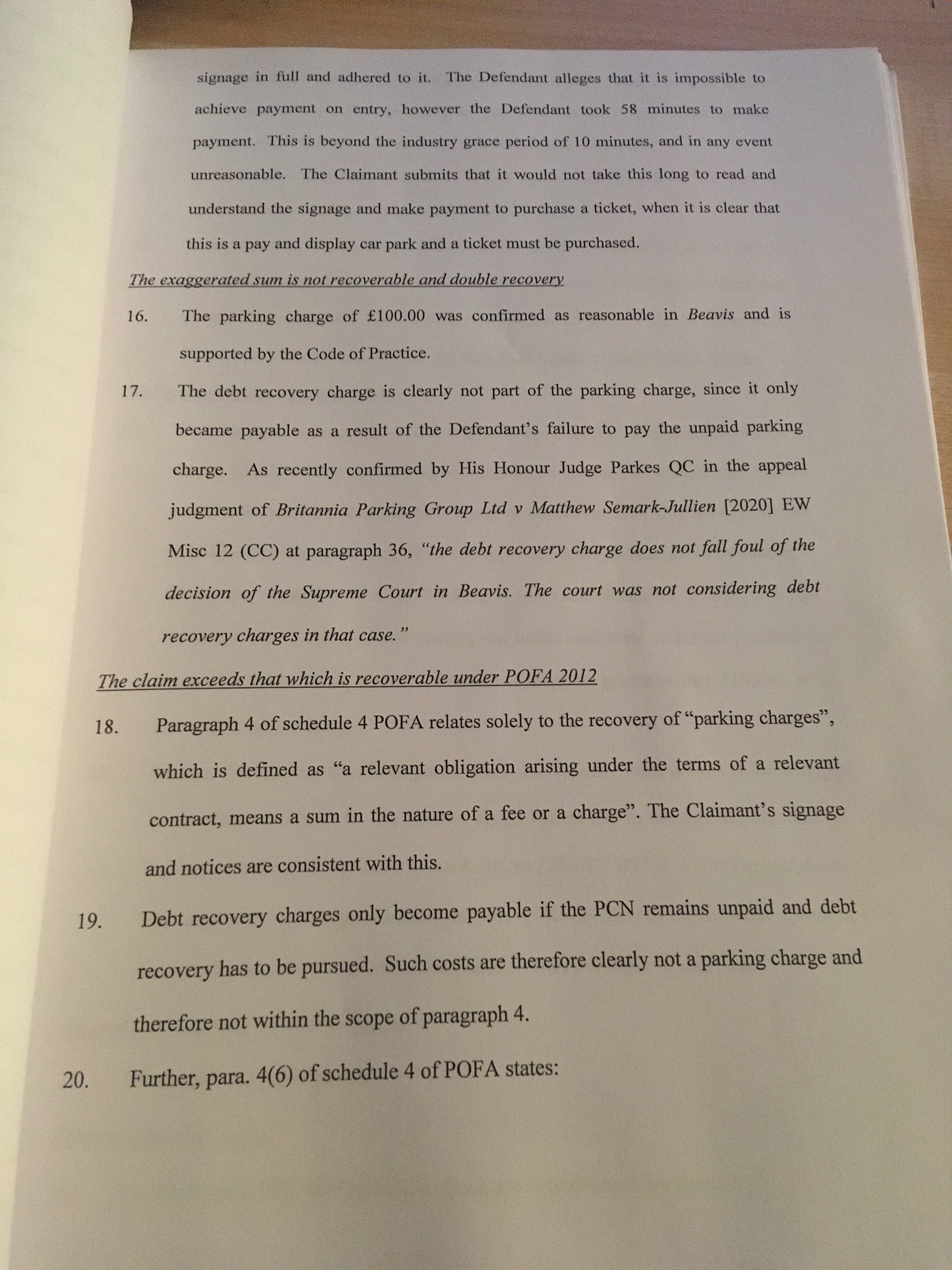 8. Pursuant to Sch4 of the POFA at 4(5), the sum claimed exceeds the maximum potentially recoverable from a registered keeper, even in cases where a parking firm has complied with its other requirements (denied in this case). It is worth noting that even though the driver was known in Beavis, the Supreme Court considered the POFA, given that it was the only legislation specifically dealing with parking on private land. There is now also the Parking (Code of Practice) Act 2019 with a new, more robust and statutory Code of Practice being introduced shortly, which evolved because the two Trade Bodies have failed to properly govern this industry.