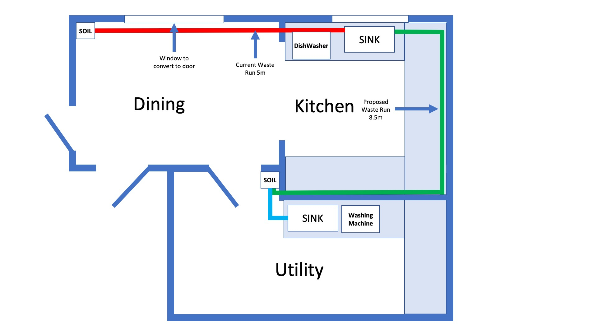 We are looking to replace our kitchen in the near future and add a door to the garden from the dining area. The problem we have is that the kitchen is in an extension and currently the sink/dishwasher waste was just extended to go across the bottom of the window, we want to make into a door, to the soil stack in the corner about 5m away.