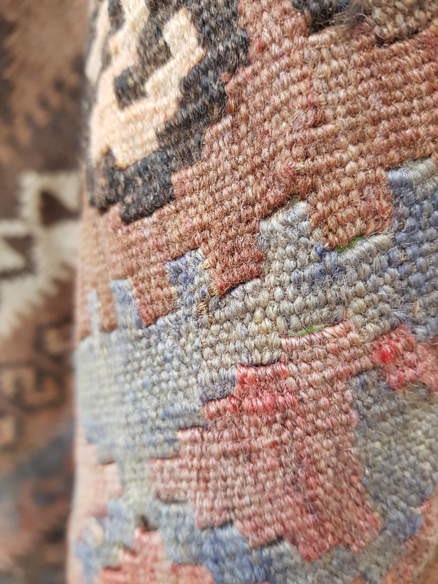 ~That looks like hand woven wool. The pattern very like some from the Andes so possibily Alpaca which would account for the smell.Keep it a really cool wash as the colours may run. It's likely to shrink a bit even so but as cool as possible and you should hardly notice, hot water makes wool felt.It may smell bad when wet. I'd put it out flattish over a rotary airer or whatever you can, after washing, on a rainy day. The rain and fresh air should freshen it though it's a bit of a palaver and will take longer to get dry but worth the trouble. If it's not dirty I'd try this first before washing.Alpaca wool washing https://www.thelaundress.com/how-to/alpaca.htmlLove the rug.