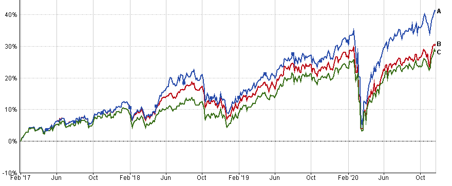 Above is a chart that shows VLS60 in green (28.38% up in that period). A portfolio of the same risk level taken out using Jan 2017 weightings and left to its own devices without rebalancing in red (30.74% up). And the Blue is the same portfolio rebalanced using fluid weightings (41.07% up).0