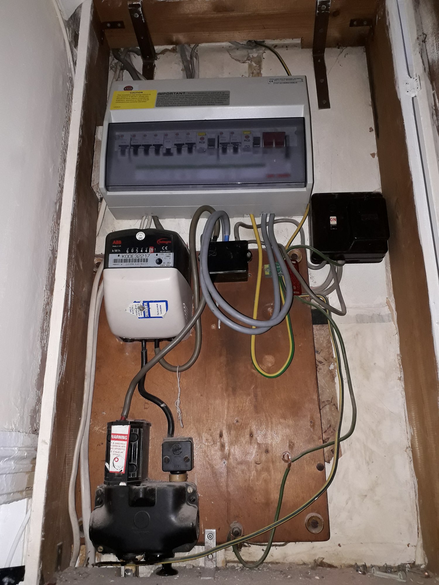 As noted if the green wire is the earth then the fact it has a bare section shouldn't be dangerous but that doesn't mean it should be as it is. I see from your photos one of the switches has tripped, is that the reason for the upstairs room not having power and id it trip because what ever the tenant plugged in has a fault.bumblebee15 said:I live in an HMO with what I consider to be very dodgy landlords. There has been a catalogue of harrassment, privacy invasion, not providing documentation etc and it has got to the point having been left with a broken window held together by gaffer tape overnight that I am seriously considering reporting them. There are no fire doors, no smoke alarms and I worry all the time about our safety as the LL's husband does dodgy repairs on almost everything. I am cataloguing everything in preparedness to make a complaint after last night's shenanigans which resulted in me (single woman in ground floor, street facing flat) being left with nothing to keep me safe and secure apart from gaffer tape stuck around a window frame after the LL's husband came to 'fix' the handle then disappeared for nearly 4 hours before returning at 5.30pm claiming the shops that sell handles were all closed and the best he could do was give me gaffer tape to close the window!