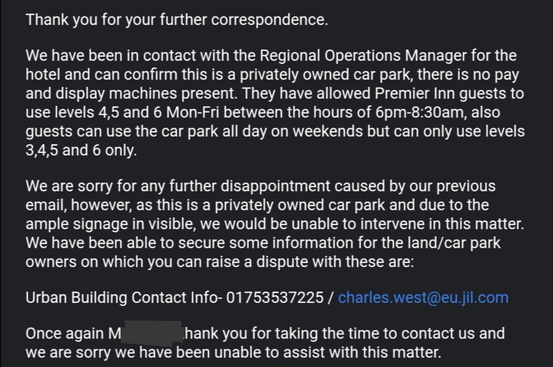 I'm unsure what to do from here... I got an email back from the Premier Inn executives team saying that the car park is private and Premier Inn guests can use it from 6pm-8:30am, but that there are NO TICKET MACHINES.