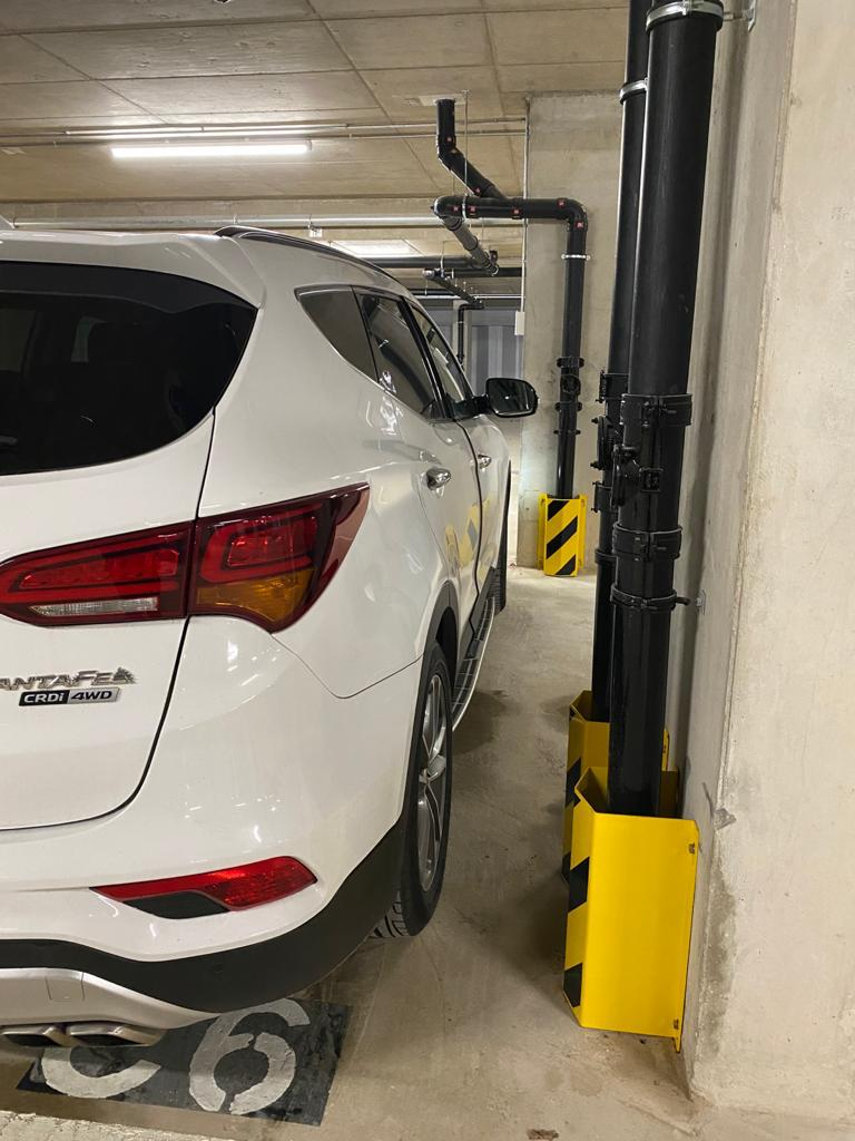 You bought this as a New Build from the Developer?If the Contract and deeds clearly specify this area to be a parking space, and it is clearly impossible to park there, then you need to get the Developer to move the pipework which is trespasing on your space.Unless perhaps you have a super-sized vehicle, anda more 'normal' vehicle would fit.2