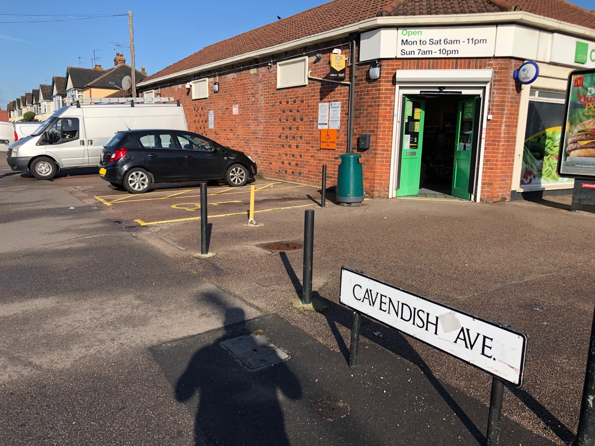 This is position of the signs to the shop, car was parked between where the van and black car is in pic.