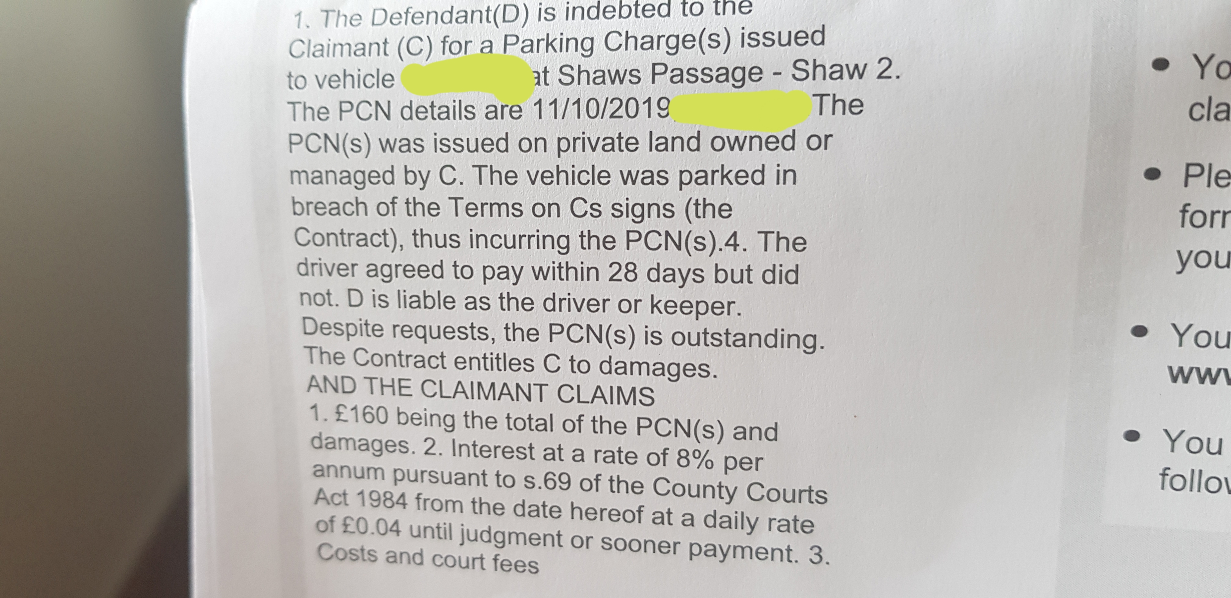 2. It is admitted that the Defendant was the registered keeper of the vehicle but liability is denied. The Defendant had paid the correct fee (£3.50) for parking on 11/10/2019 but not known to breach any parking regulation at Shaws Passage. The Defendant paid the correct fee for parking. The PDT issued the ticket and the defendant received the ticket and displayed it correctly [on the dashboard of the car]. The proof will be given on the witness stage. Evidence of having purchased a ticket will be provided at Witness Statement stage.