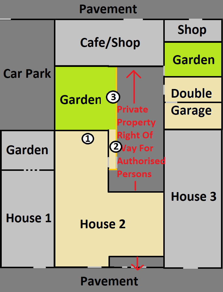 However, it's a weird one that I've not seen before as there's a essentially a right of way that goes "through" or "under" the house so that people can access the back of the cafe/shop that is behind us. Hopefully the diagram I put together can explain this (not to scale):