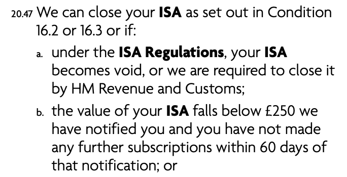 Thought about opening the iWeb S&S ISA account now, in preparation for next tax year, however, this T&C (20.47b) would seem to deem it inadvisable as they could close it anyway before then, as I cannot fund it with anything in 20/21: