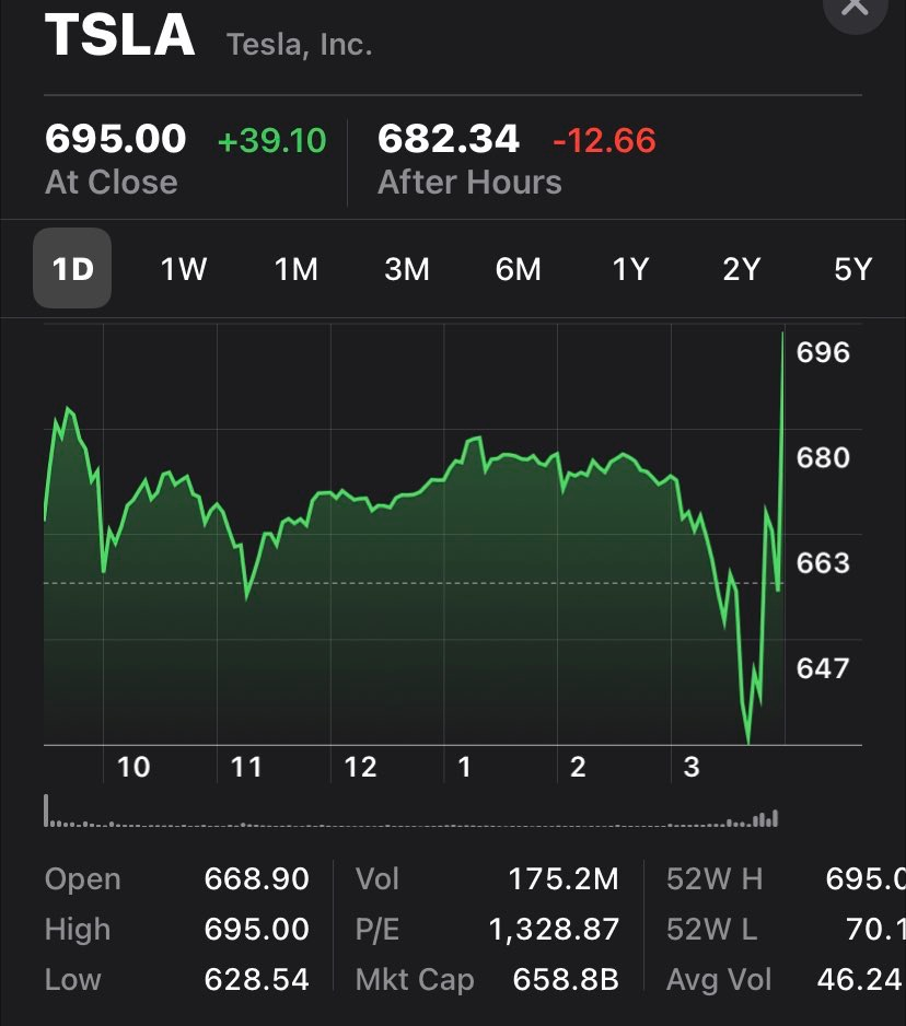 Secret2ndAccount said:This one's easy. You have made a massive gain in Tesla. Take out your initial investment and put it in something with a more predictable return. Then you are playing with the house's money. If Tesla doubles again, woohoo! If it halves, you still have all your original money, and a fair bit more.Tesla's price is unjustifiable, but it has been for a long time, and it still keeps going up. So I don't think it's fair for anyone to say they can predict the future of Tesla stock wth any certainty. Remove the psychological stress by protecting your initial investment. Then you can enjoy the ride.Only if you look in the rear view mirror or compare them to legacy ICE manufacturers.They will be likely producing 6x the number of cars as now, in just two years time.And then perhaps double that 2 years later.They have oodles of cash, they build new factories at 2x-3x the rate of other OEMs, no debts to speak of, and a demand problem thats nice to have, eg every single car they make is bought at list. Unlike the usual suspects they are not debt ridden either. Nor full of stranded IP assets in the form of patents on ICE - fuel injection exhausts turbos blah blah blah.VW boast about 40k orders for the ID.3, Porche 20k for the Taycan, Tesla have 800,000 for just one of their models alone.I think if Ford had a wait list of 800k orders for the new Mustang, their share price would also be high. As it is they've crippled themselves with very modest production targets that are now set in stone for at least 2 years and having to fight for batteries with every other supplier. I dont think there is any equivalent in the ICE world for this limited resource.Hyundai/Kia make excellent EVs but seemingly forgot to order enough batteries, Toyota recently splurged about their new solid state battery car - wont be available for about 5 years time meanwhile they burn money on a vanity H2 fuel cell project.GM dont plan to produce a million EVs until 2025. Tesla will do that next year.A couple years ago, Elon Musk said the one thing they never factored into all their business contingency plans was that legacy auto would be so poor at producing good EVs.However, i do think you have a good plan for someone thats nervous, "Remove the psychological stress by protecting your initial investment. Then you can enjoy the ride."eg taking out the initial stake, maybe more, even half, and put it in something else thats more stable.As you can see I"m very bullish on Tesla but i dont have all my pension in it ! Thats why i haven't bought more. And Ive just sold 20% of my Apple shares to help buy a house but the reason i chose that was, same issue, too many eggs in that one basket.. I'll probably long term lose money on that but you do have to be able to sleep at night and maintain a risk level that works for you.p.s to the OP. Expect Tesla to rise substantially this week. Index funds still must buy an enormous amount of stock and most havent bought any yet as they are prohibited buying until 3 days before. Not all but most. Some of that rise will be diluted by people selling who bought in expectation of that but it cant all be. There's a huge amount of buying still needed and a lot of shares locked up. So, if you were going to sell I'd wait until w/b 21st at teh earliest. One other factor, if Tesla hits its 500k production target then expect another rise in Jan. (or a fall if it doesnt) Currently its looking like it will.My bet is 700 by end of the week, drop to 600-650 next few weeks, then 750 by late jan.Thats prediction BTW is worth exactly what you've paid for it0