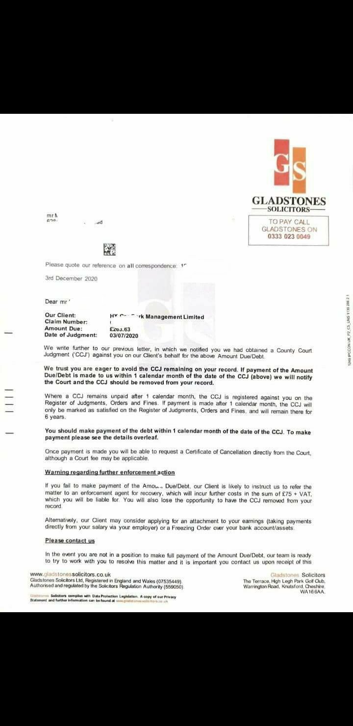 Don't PHONE parking firms or their solicitors. Obviously you email Gladstones (search the forum for their email addy) and ask if the Claimant will consent to set aside and ask for a copy of the claim form and LBC because it never arrived and you know Gs must supply these under a SAR, plus any other data Gs hold.PRIVATE 'PCN'? DON'T PAY BUT DON'T IGNORE IT (except N.Ireland).