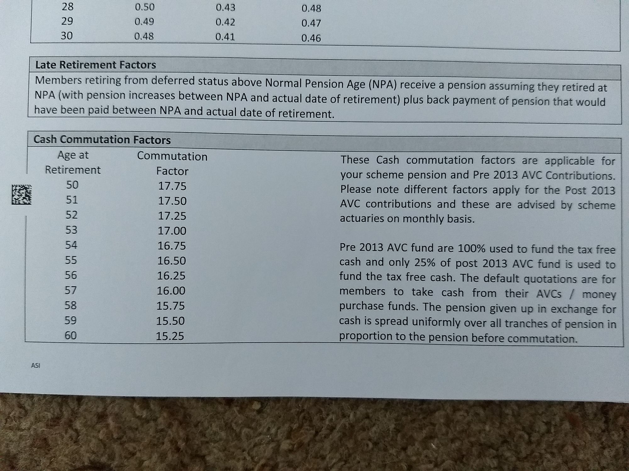 Earlier I said that my factor was 13 but I was wrong. The actual figure is 16.5 and the lump sum offered is £132k in exchange for £8kPA reduction in my pension. 16.5 x £8k = £132k. Secret table attached!Silvertabby said:Apples and oranges. The HMRC 25% maximum tax free cash in respect of DB schemes is calculated thus:20 x annual pension plus 1 x any automatic lump sum x 25% (before applying the commutation factor).However, this doesn't tally with the figure you quoted - a pension of £27,809. Is there any automatic (pre commutation) lump sum? If so, what is it?