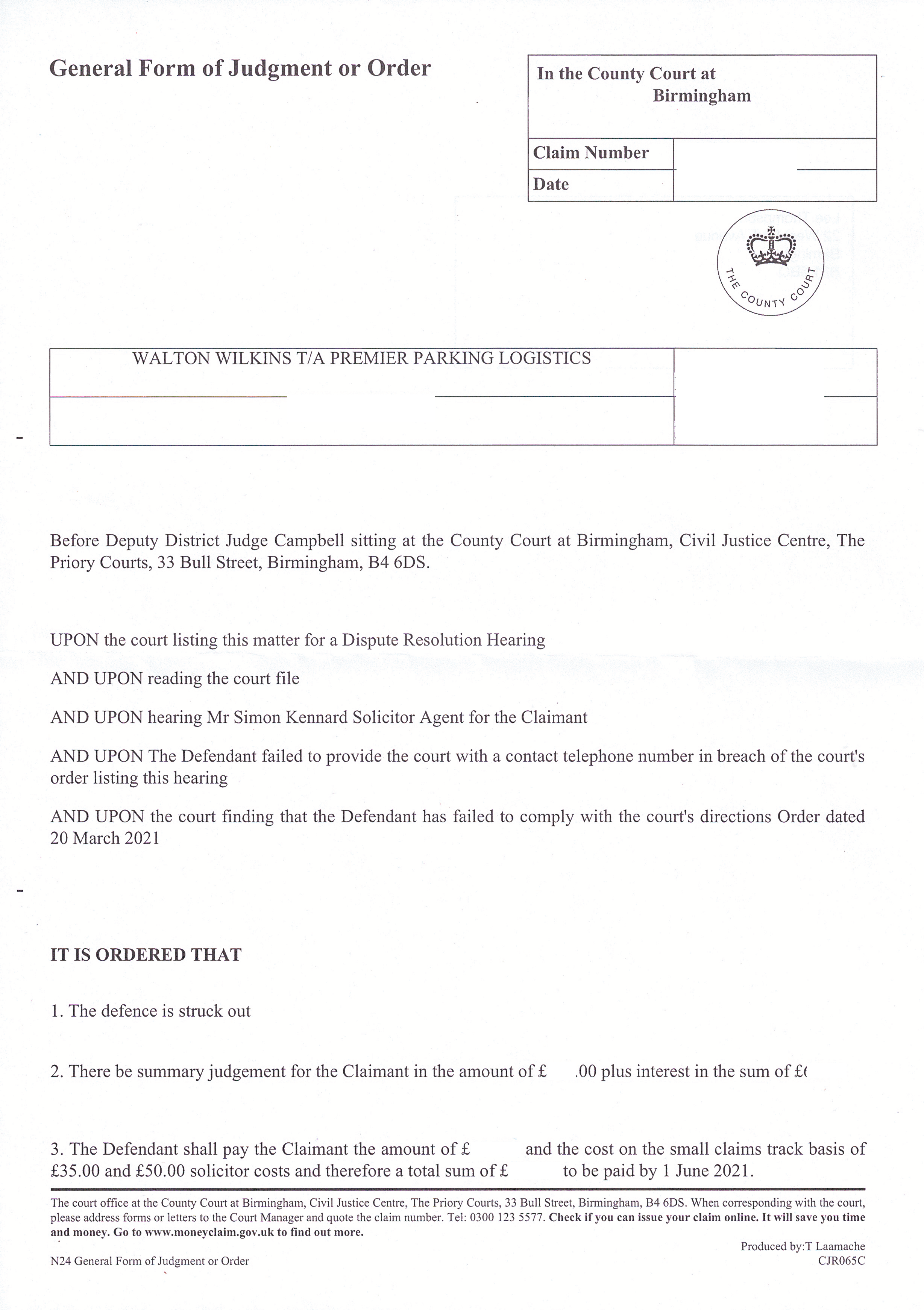 So I have called Birmingham County Court again this morning and explained I have had my defence struck out failing to provide a contact telephone number and ordered to pay the total sum by 1June 2021.