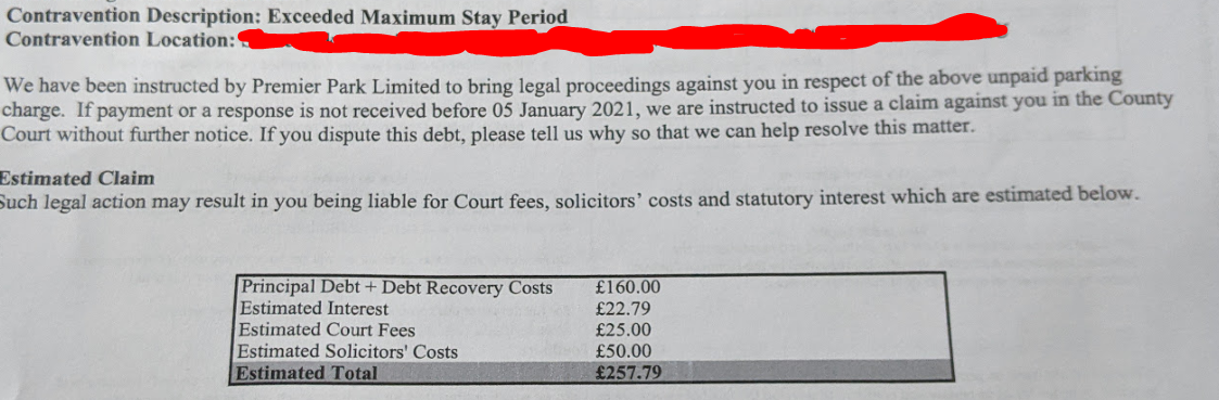 I have received a Letter of Claim from BW Legal representing Premier Park Limited . The letter says the contravention is 'Exceeded Maximum Stay Period'. I've attached a screenshot of the 'estimated claim' below.