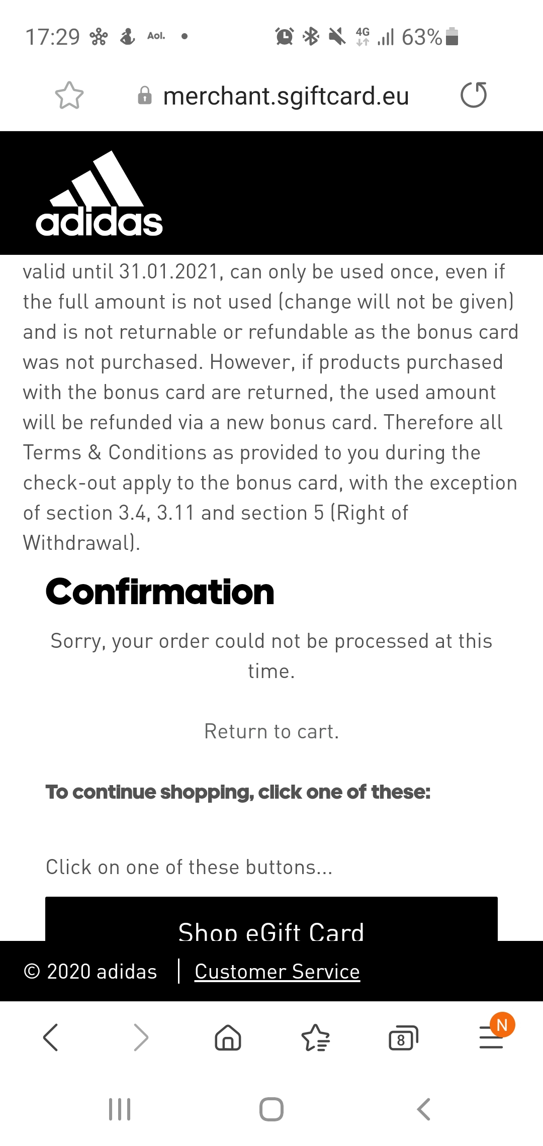 On the 12th of Dec I went onto Adidas website to purchase and voucher for my son. All went through my bank but as you can see by the attached screenshot it failed on the Addidas website. I tried again, and exactly the same happened. I checked my bank and 2 amounts were pending from my bank account. I called Addidas to find out what was happening. Long, long story short after many, many phone calls. We have no vouchers and Addidas still have my money!!